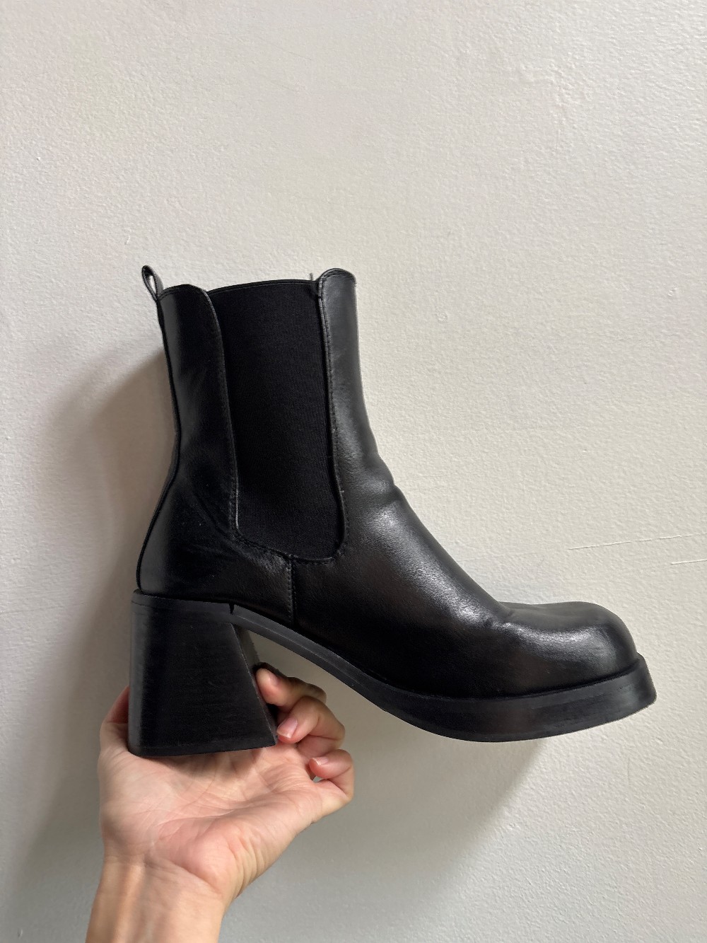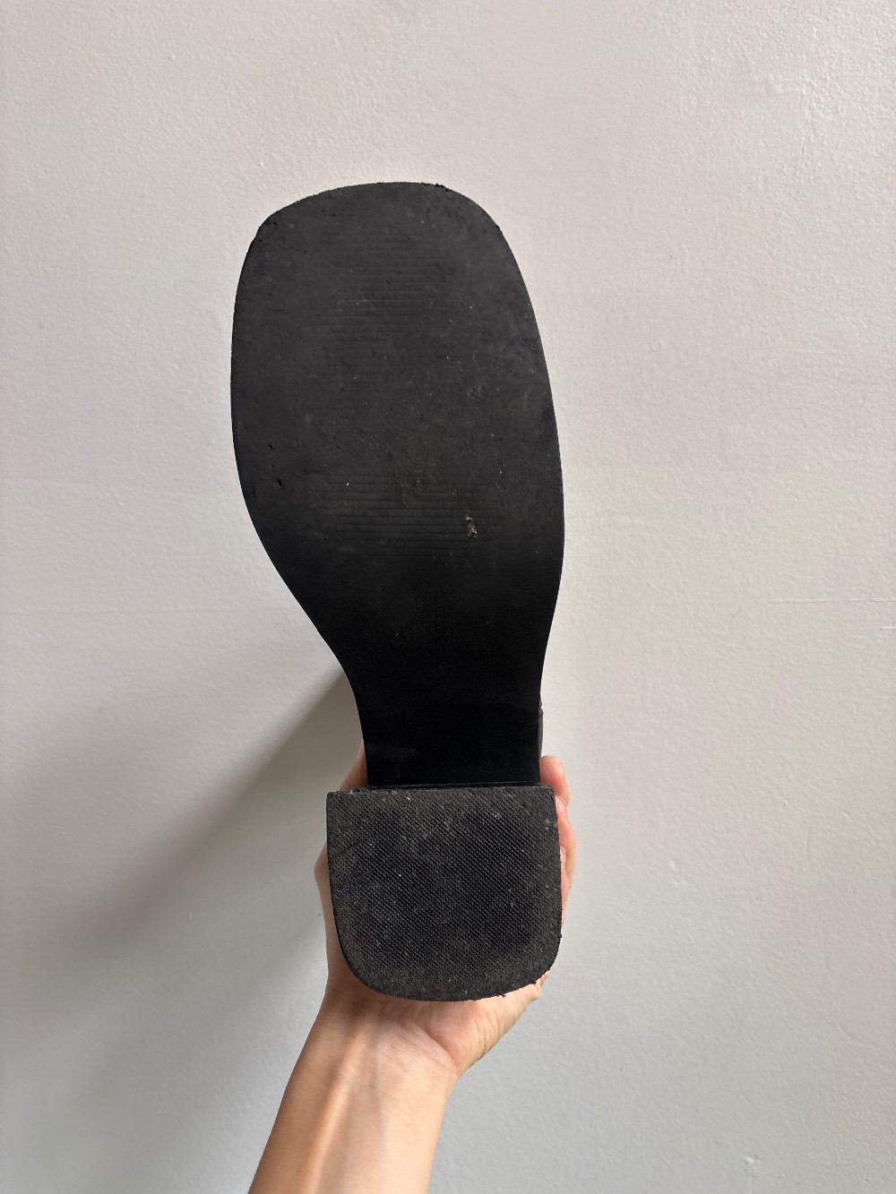 Label says 7 but fits a womens 8.5. Amazing square toe heel boots with a thick block heel, side zip closures, grip sole