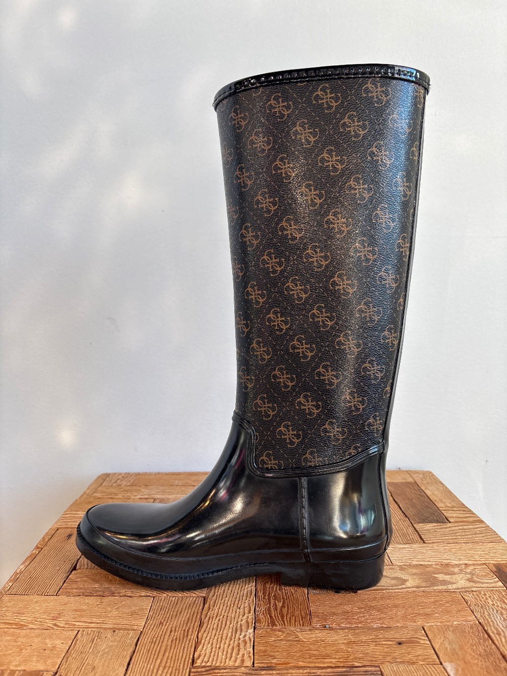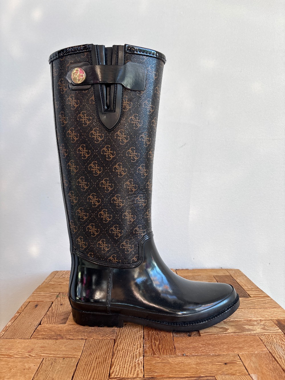 Tall rubber logo rain boots with a soft inner, logos all over sides, grip soles, side clasps, sleek outer