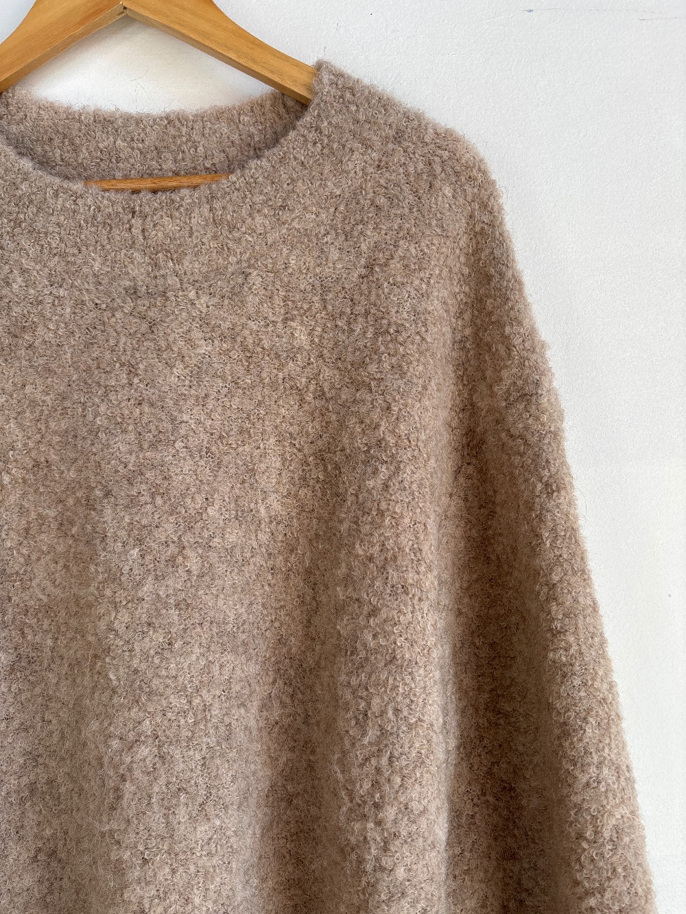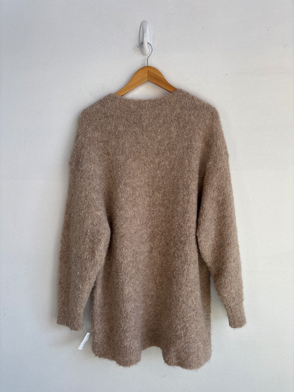 Says size 3 but would fit large-xlarge best.Super soft and cozy knit sweater with a relaxed fit. Made from an alpaca/ nylon blend. Has extra thread included.
