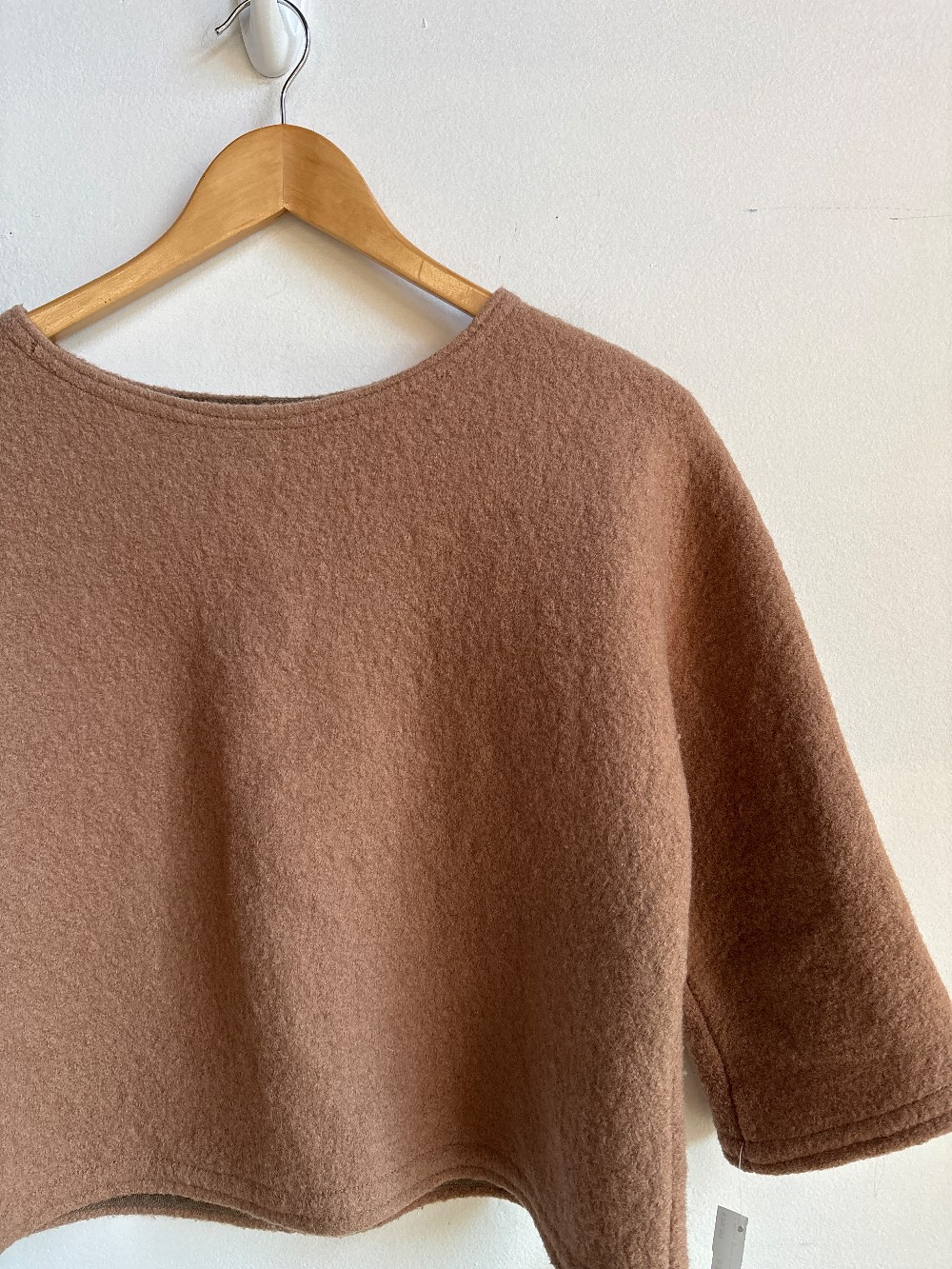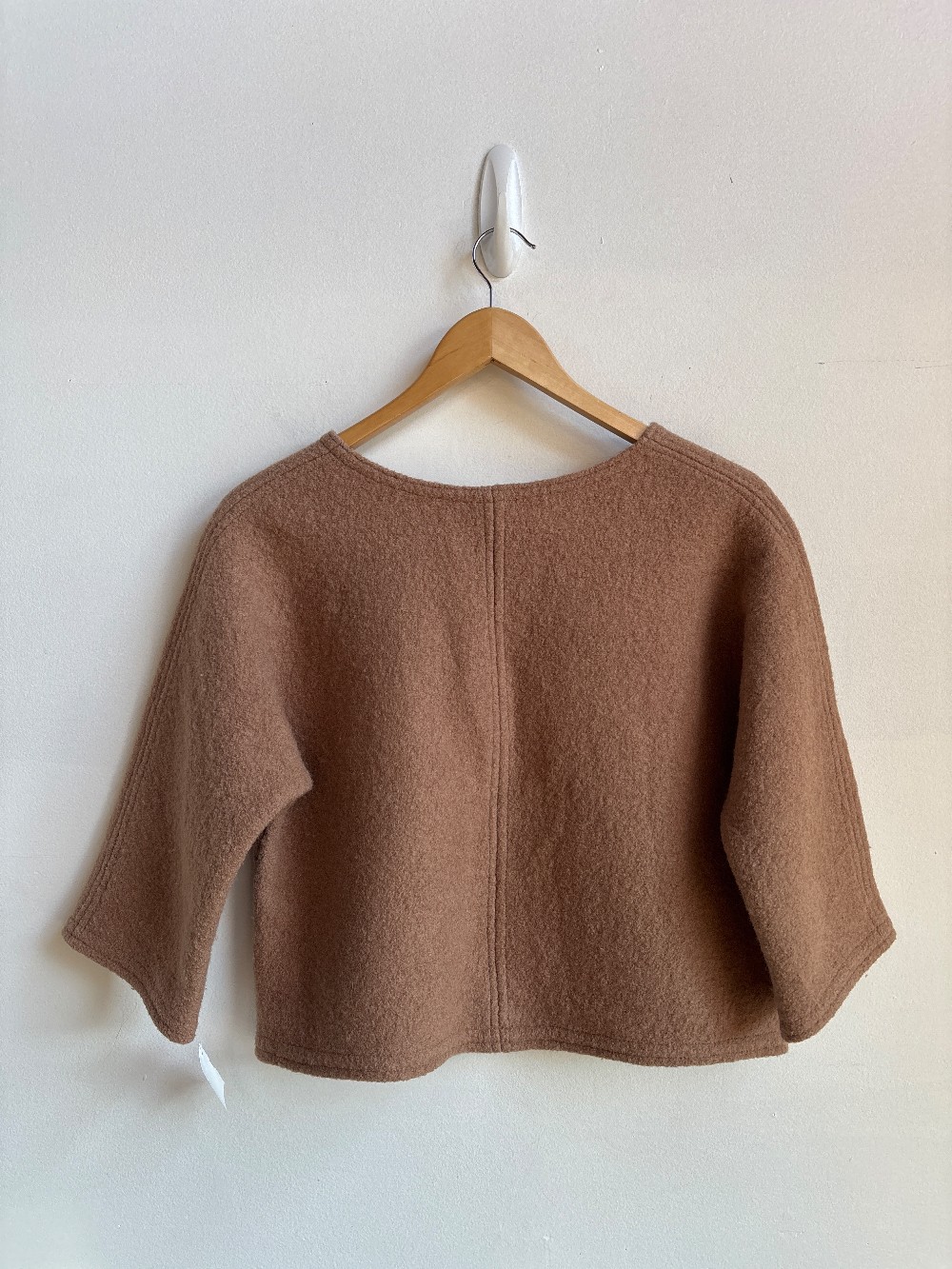 “The Greta Sweater is a cozy addition made of a yummy boiled wool making it a unique outer layer for the cool weather. Slightly closer fitting neckline. A roomy design to allow for layers - this sweater is fantastic over any of our tops, your favourite collared shirt or a turtleneck. This is considered an outer layer - it is advisable to wear an under layer as it is wool. It is the same silhouette as the Greta Dress with a dolman 1/2 sleeve + wears a bit cropped to allow for a lovely layered look.”