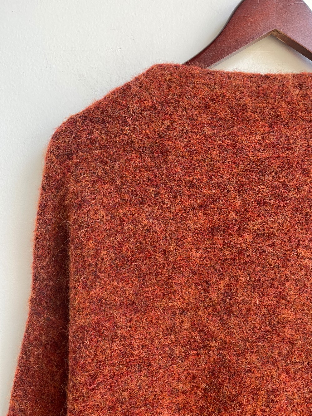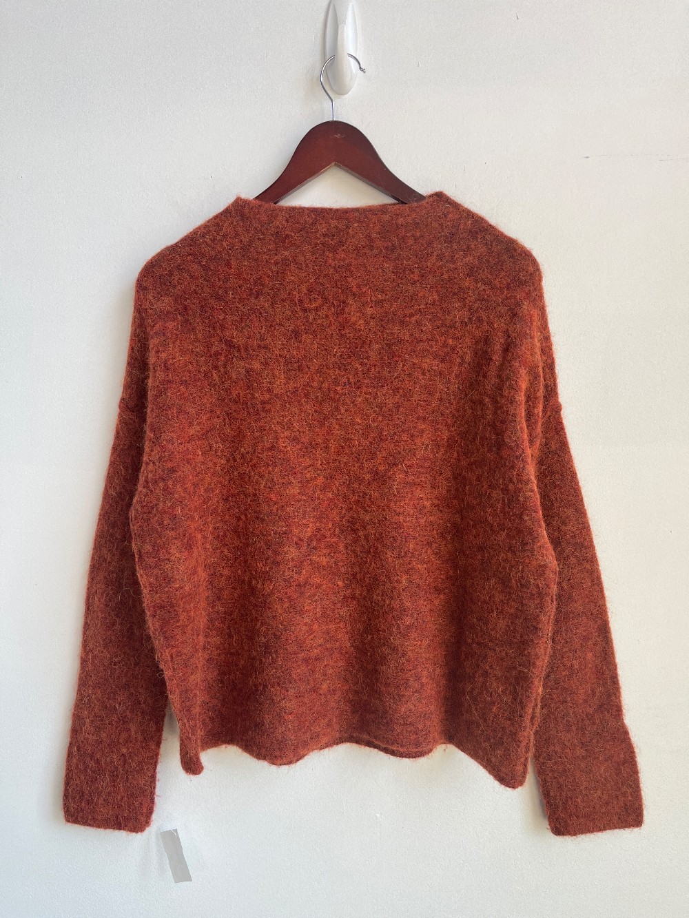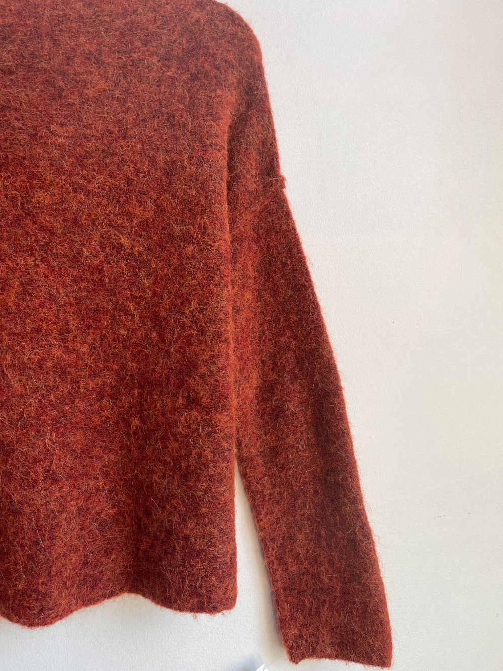A thick mock neck sweater with a relaxed fit, long sleeves, mock neck and is made from poly/ alpaca/ wool/ spandex blend
