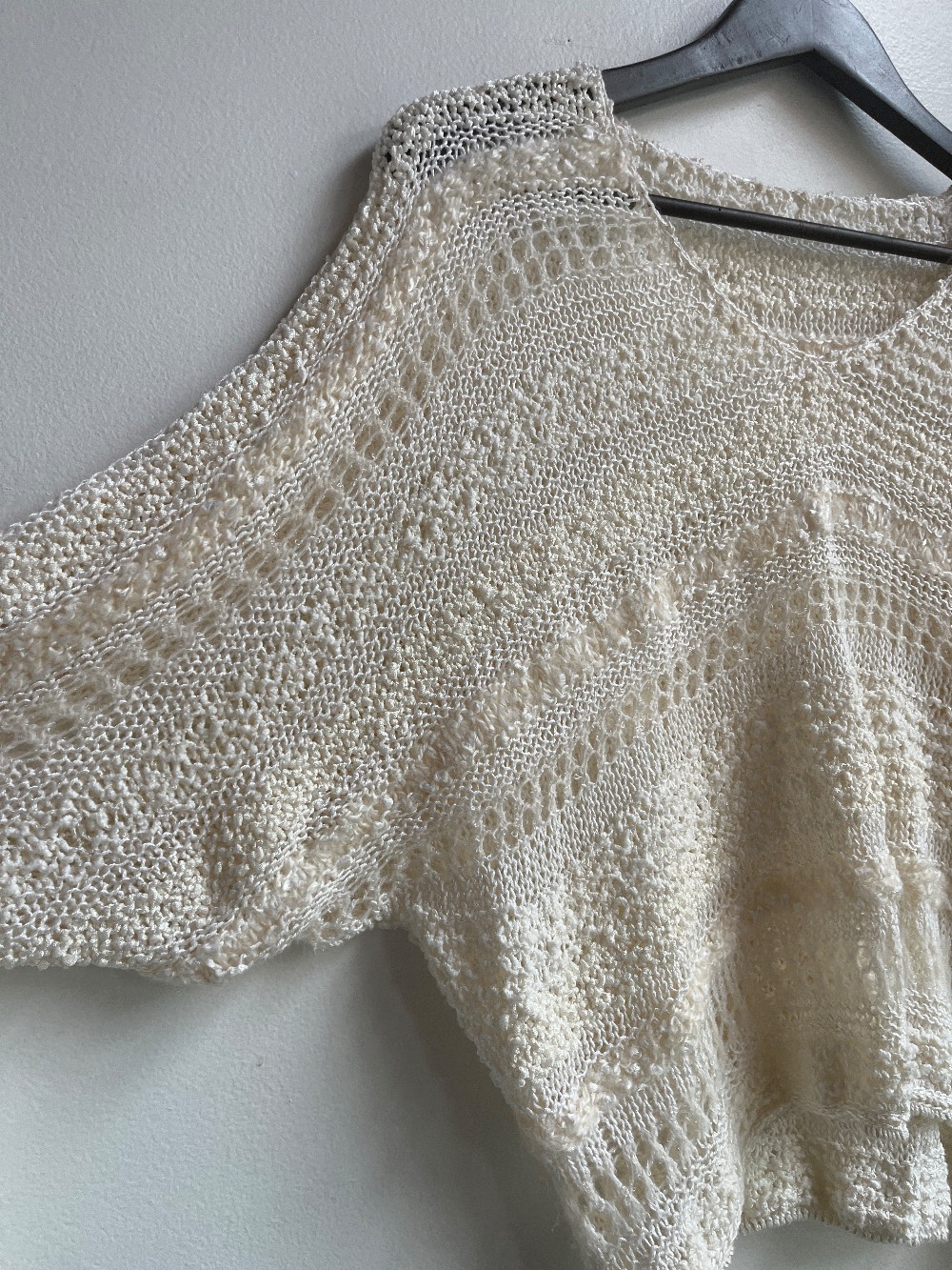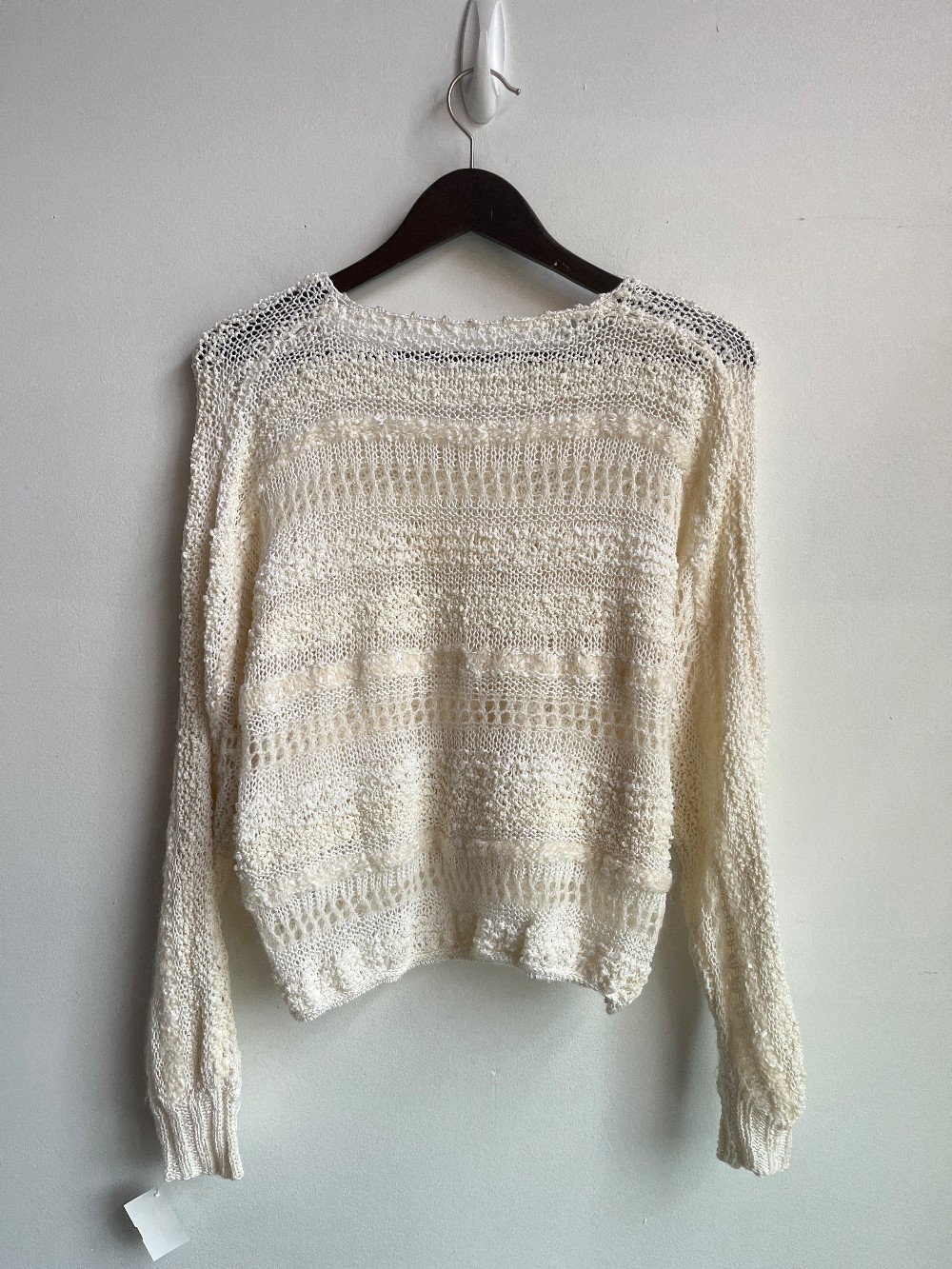 A cute multiple yarn knit sweater with a relaxed, slightly cropped waist line and full sleeves. Fits with a v neckline.