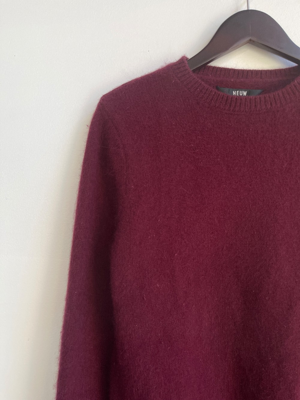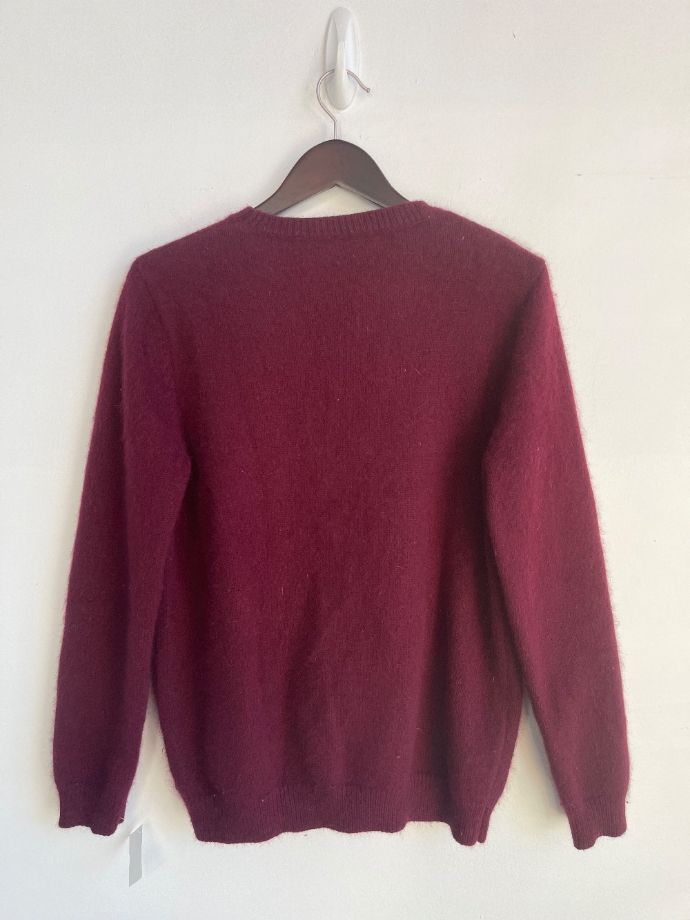 Unkown contents but feels like cashmere or wool blend. Mens sizing. A super soft knit sweater with a crew neckline, long sleeves, relaxed fit and stretchy knit.