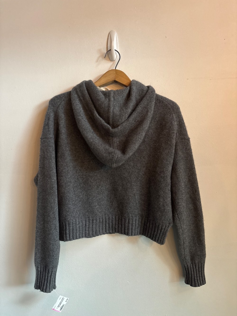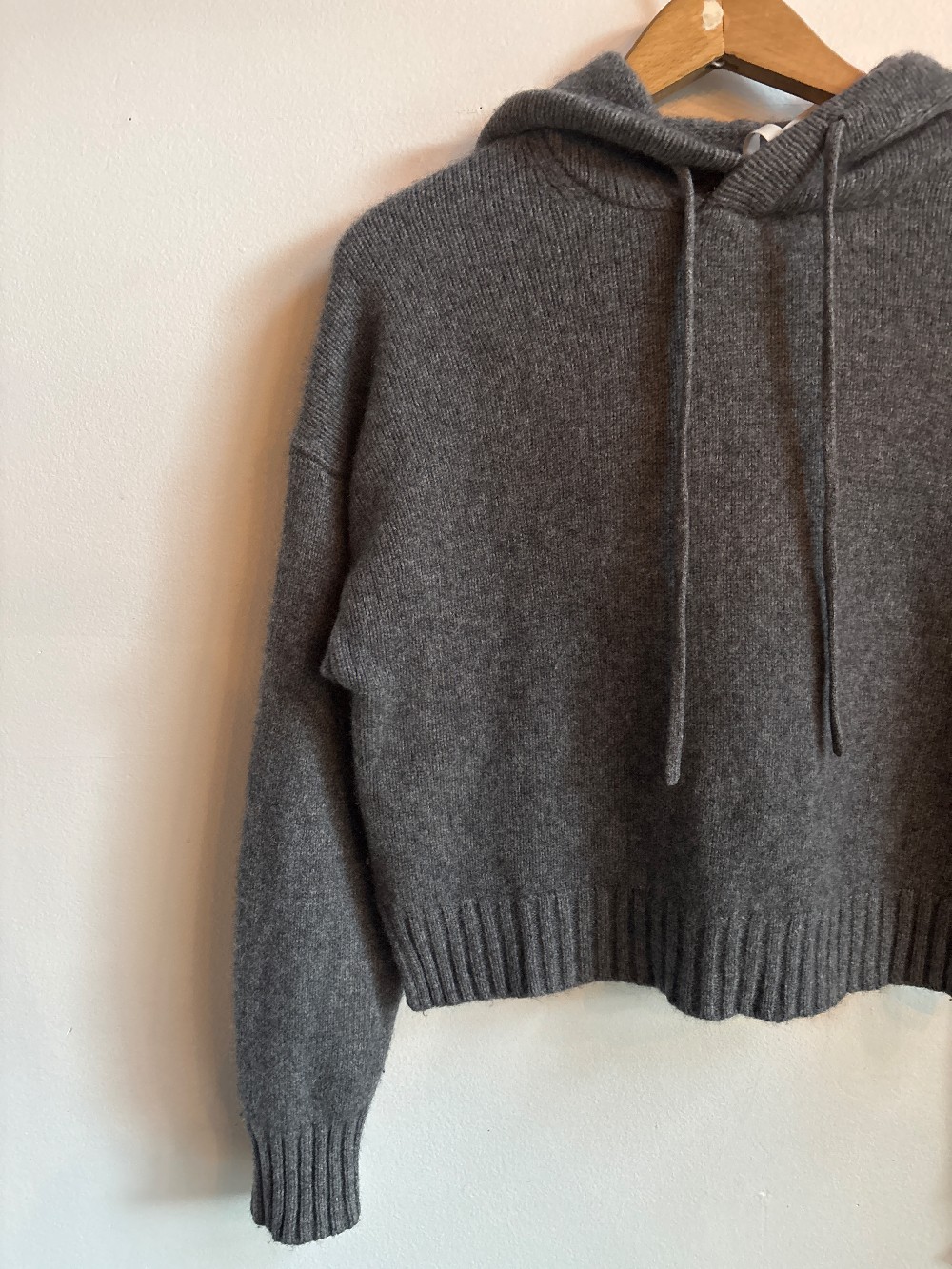 A soft cashmere sweater with a hood and two pull drawstrings. Features a slightly cropped waist line with slits up the sides and a relaxed fit.