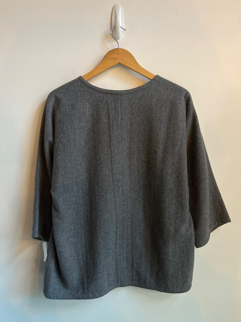 “A cozy sweater made of a yummy boiled wool making it a unique outer layer for the cool weather. Close fitting neckline. A roomy design to allow for layers. With a dolman 1/2 sleeve + wears a bit cropped to allow for a lovely layered look.”