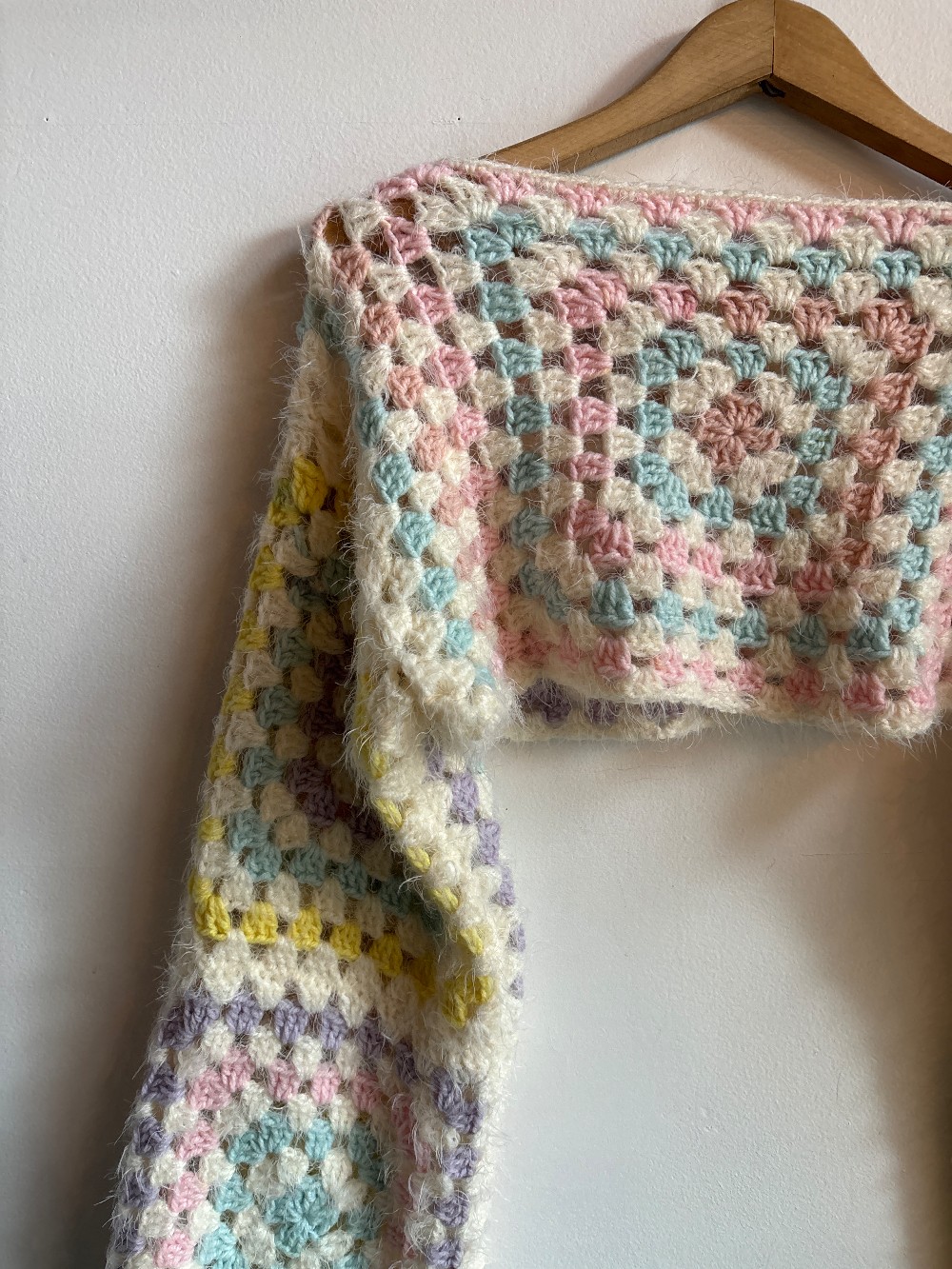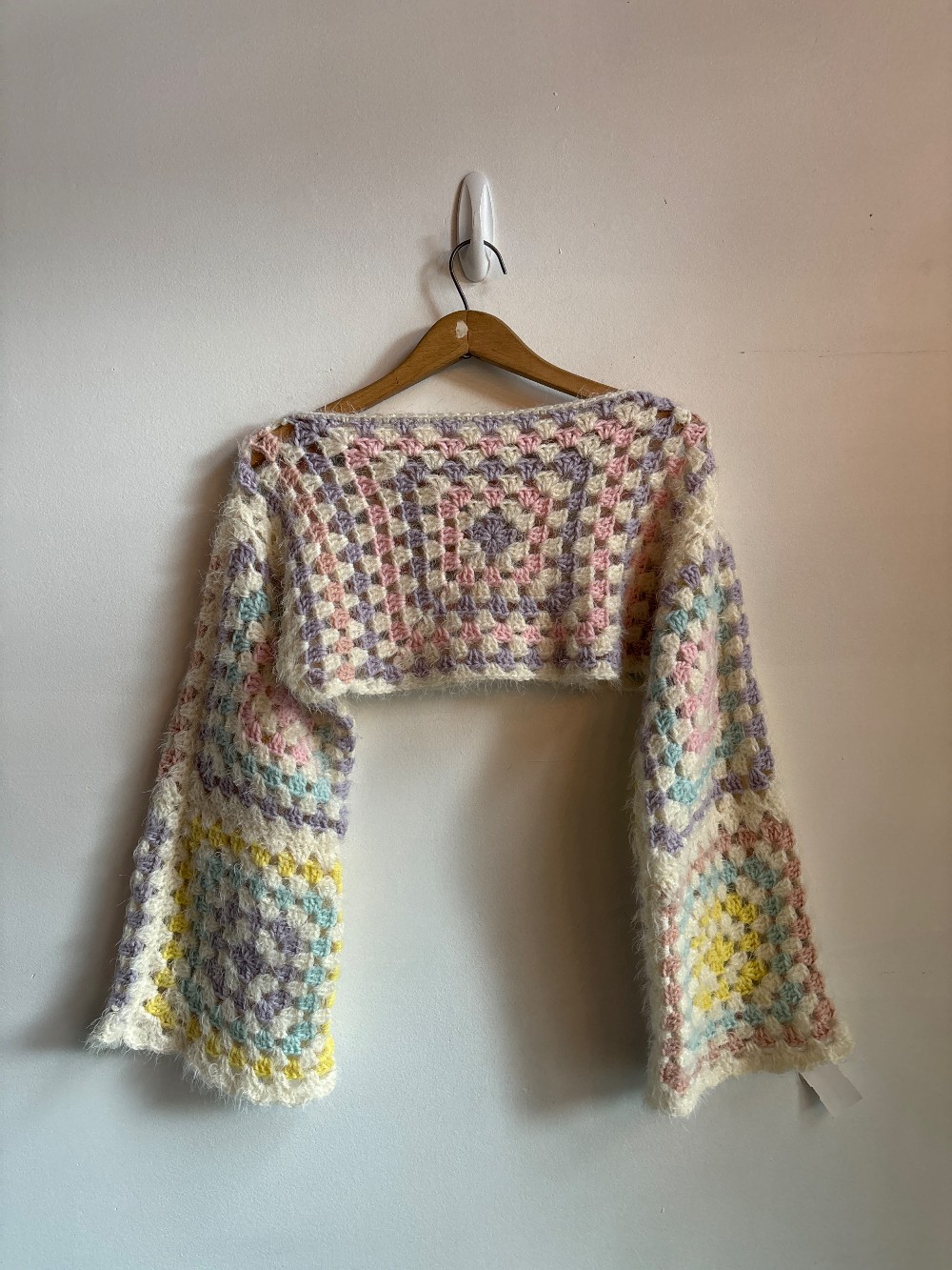 A slouchy fun granny square sweater with a super cropped fit, long bell sleeves and pastel fuzzy knitting