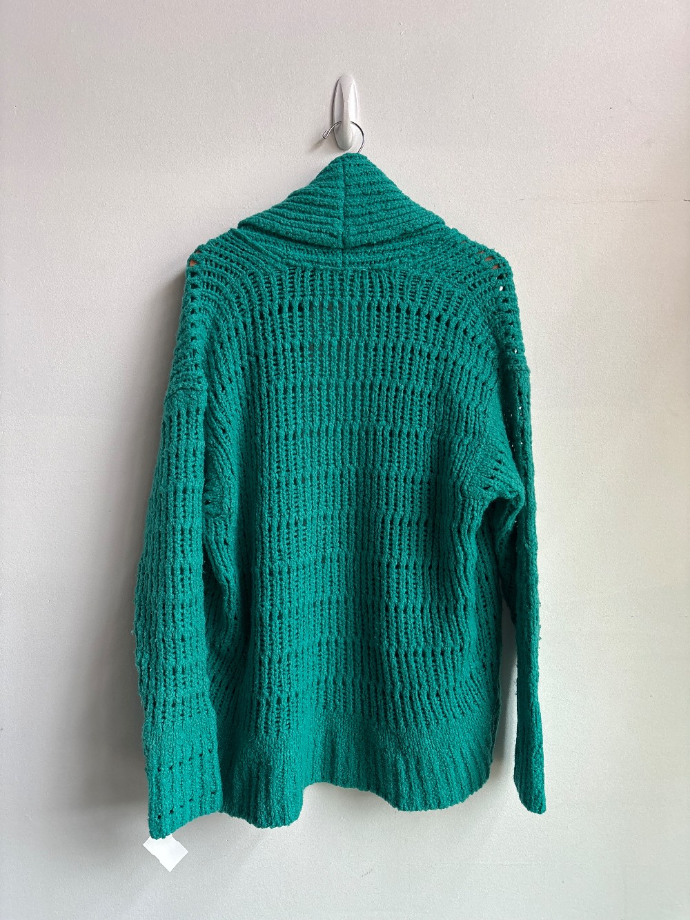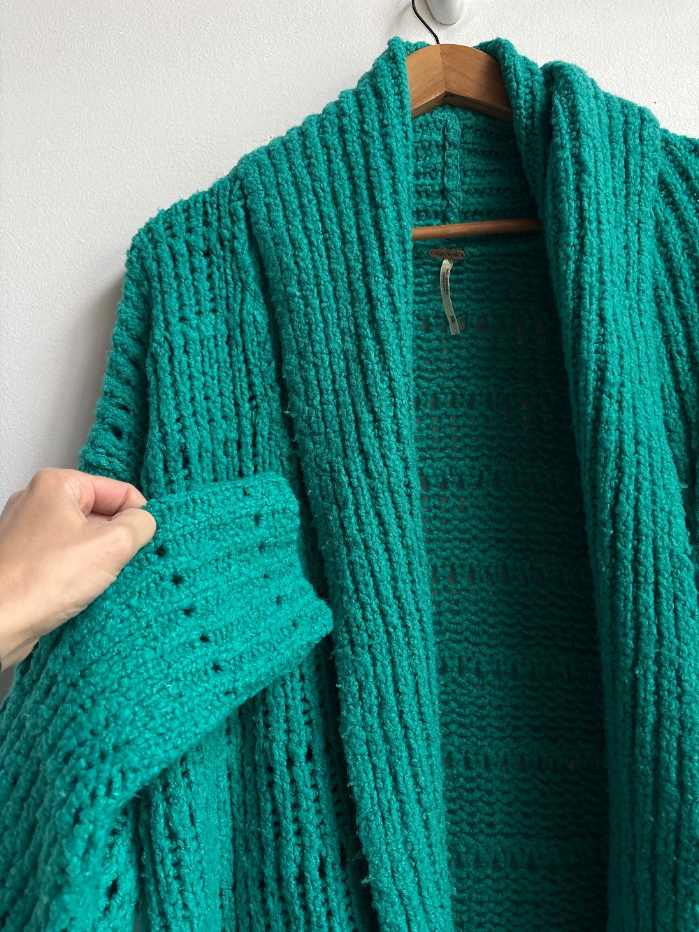 Fits larger! A cozy knit cardigan with an open front, long sleeves, ribbed material on neck. Knit is a wool/ acrylic blend