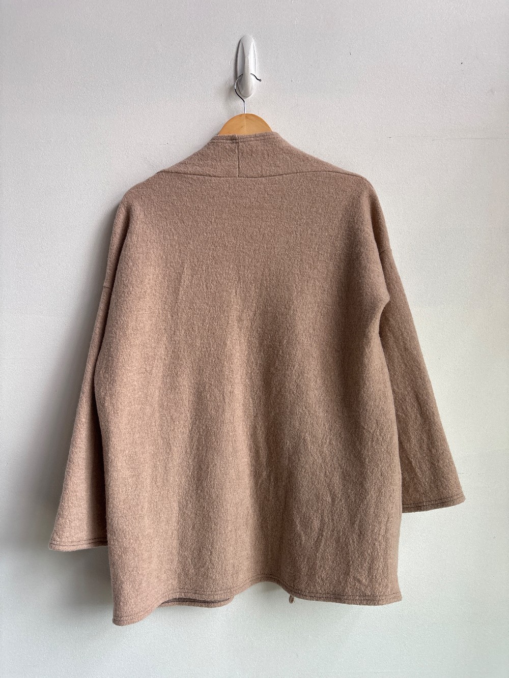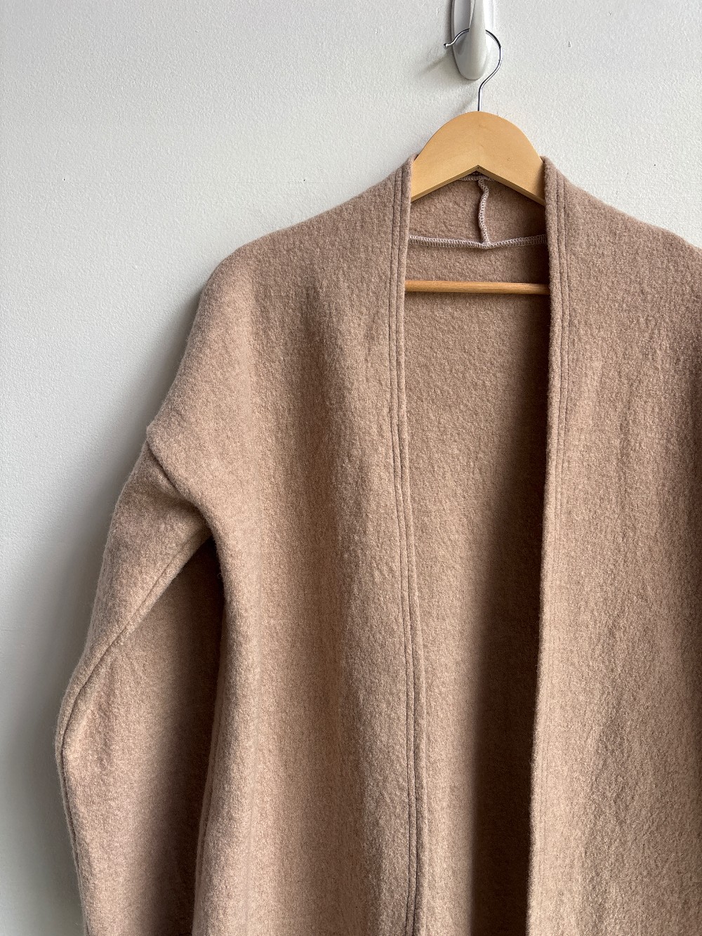 Would fit a medium best. Come in to try on! Made in Cumberland BC! A felted merino wool shawl with long sleeves and open front.” At Hidden Sheep, a slow fashion brand in Canada, we handcraft every piece with purpose and intention using soft, breathable merino wool that adapts to your body and your lifestyle. It's comfort without compromise, and a small batch alternative to fast fashion.“