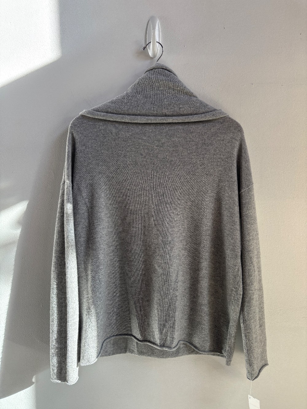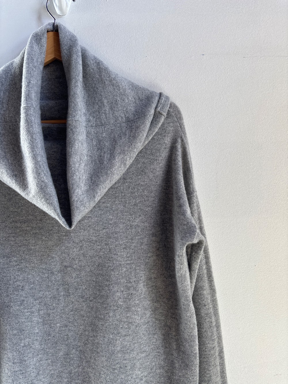A soft 100% cashmere sweater with a soft heathered knit light grey hue. Features a cowl neck, full sleeves, and a relaxed torso.
