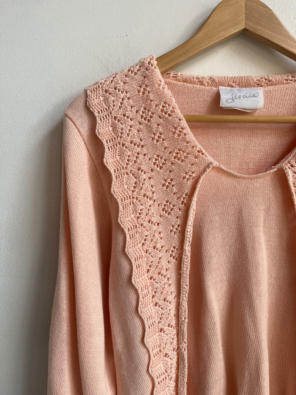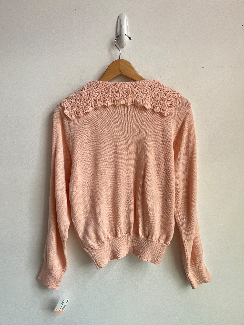 An adorable baby pink knit sweater with an embroidered long collar to tie at neck. Sleeves are long, fit is relaxed and knit is acrylic