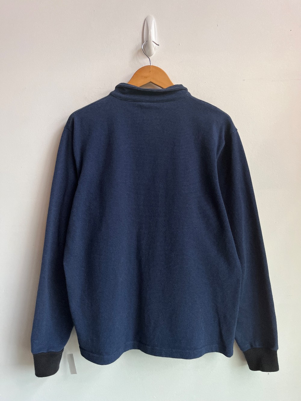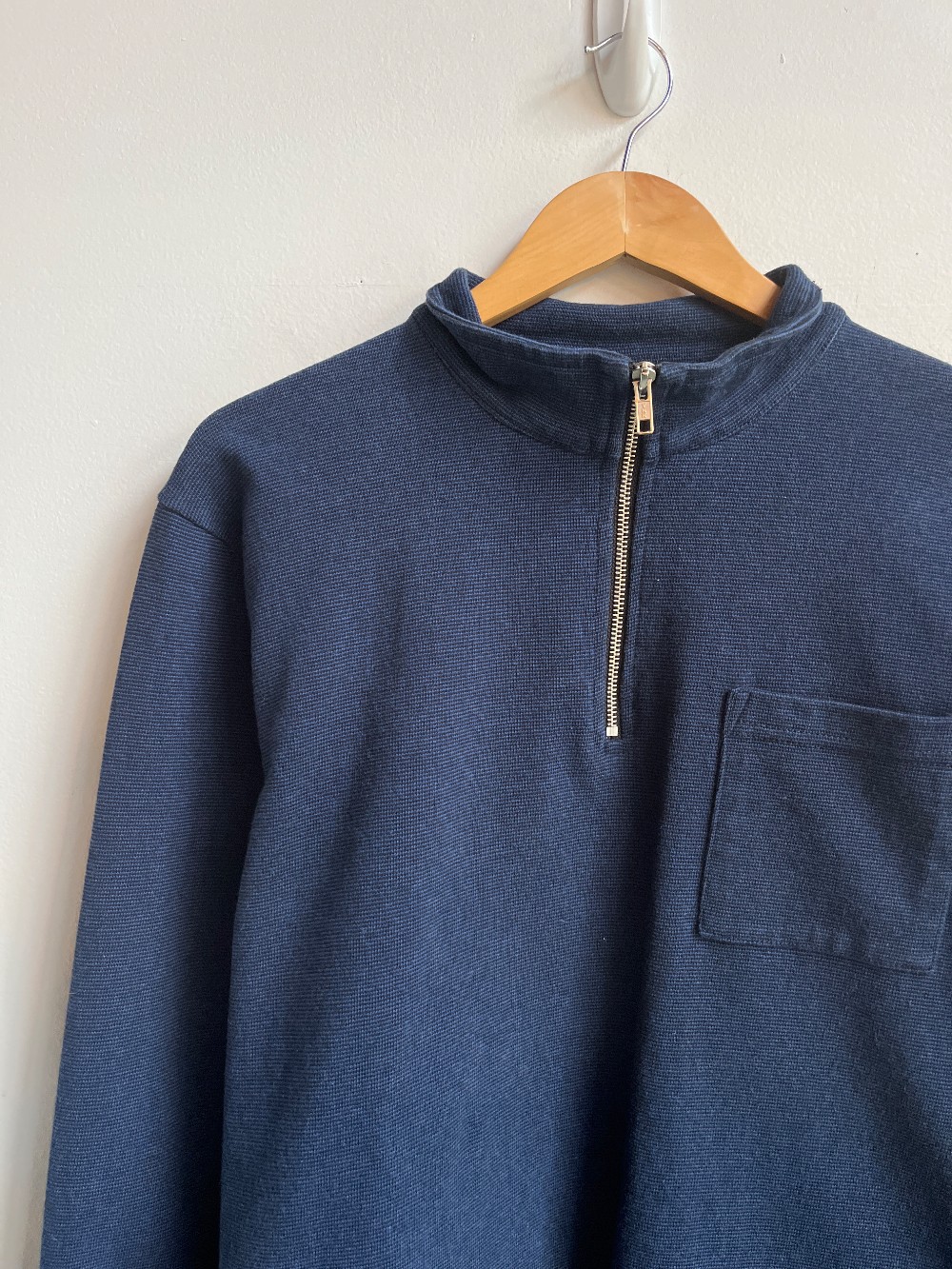 A soft knit 100% cotton sweater with a quarter zip chest and one pocket. Made in Canada!