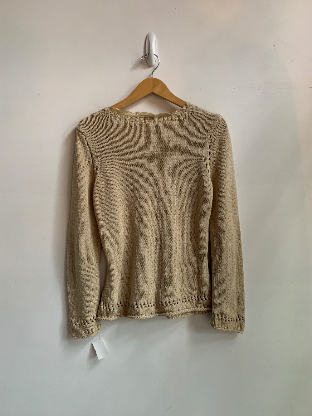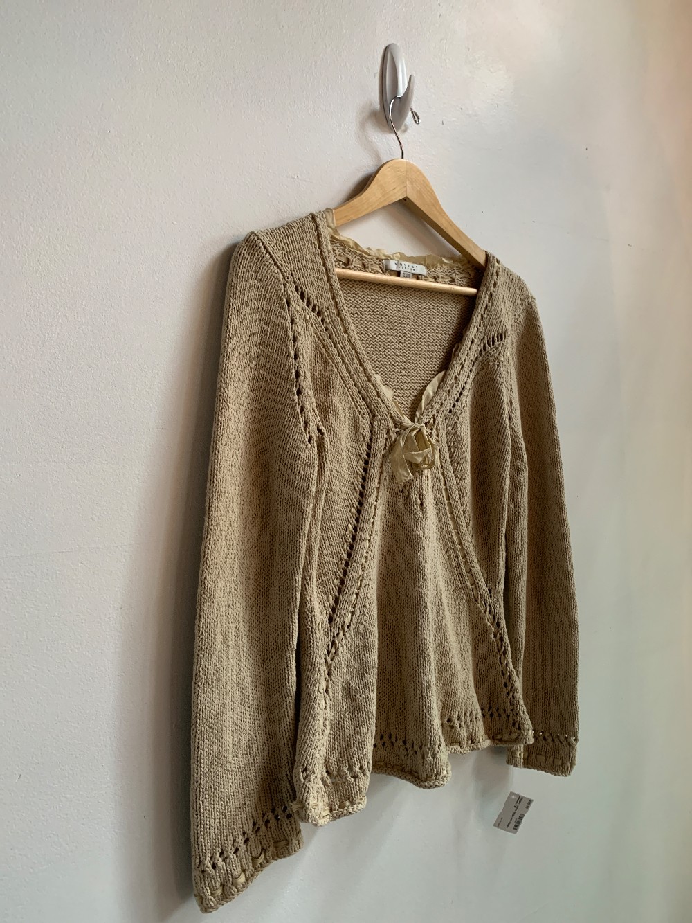 A beautiful ribbon threaded knit sweater with a v neckline, full sleeves, and a relaxed torso.