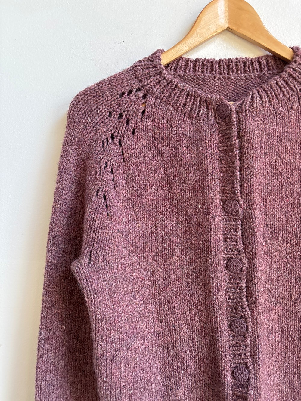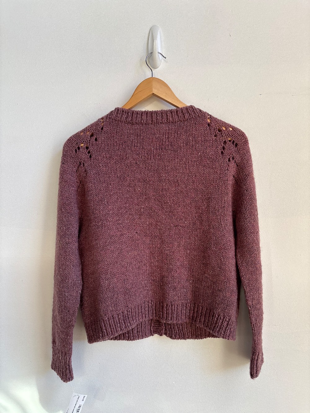 A beautiful hand knit piece with buttons along the front and ribbed trims. Made from a wool blend that is warm and soft.