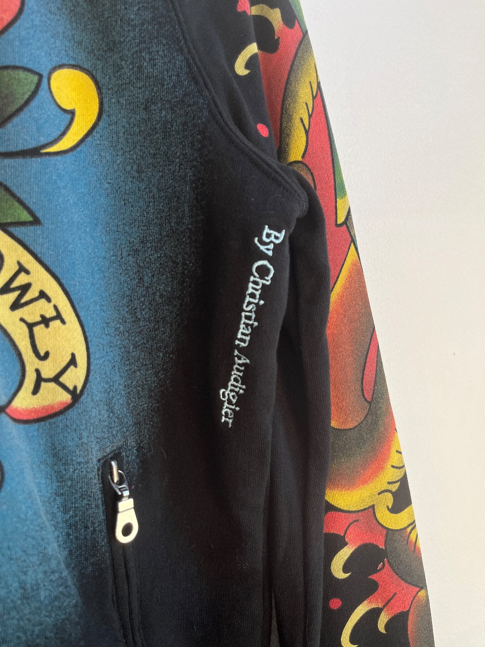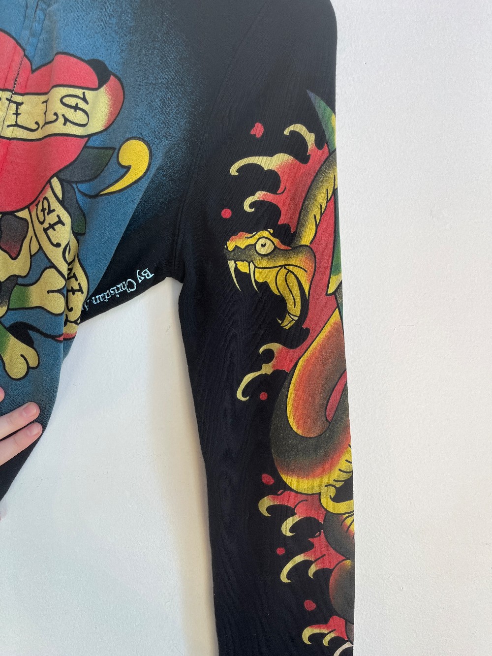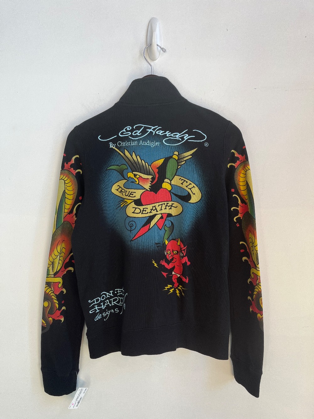Y2K vintage Ed Hardy zip front sweater with a full patterned design and embroidered detailing.