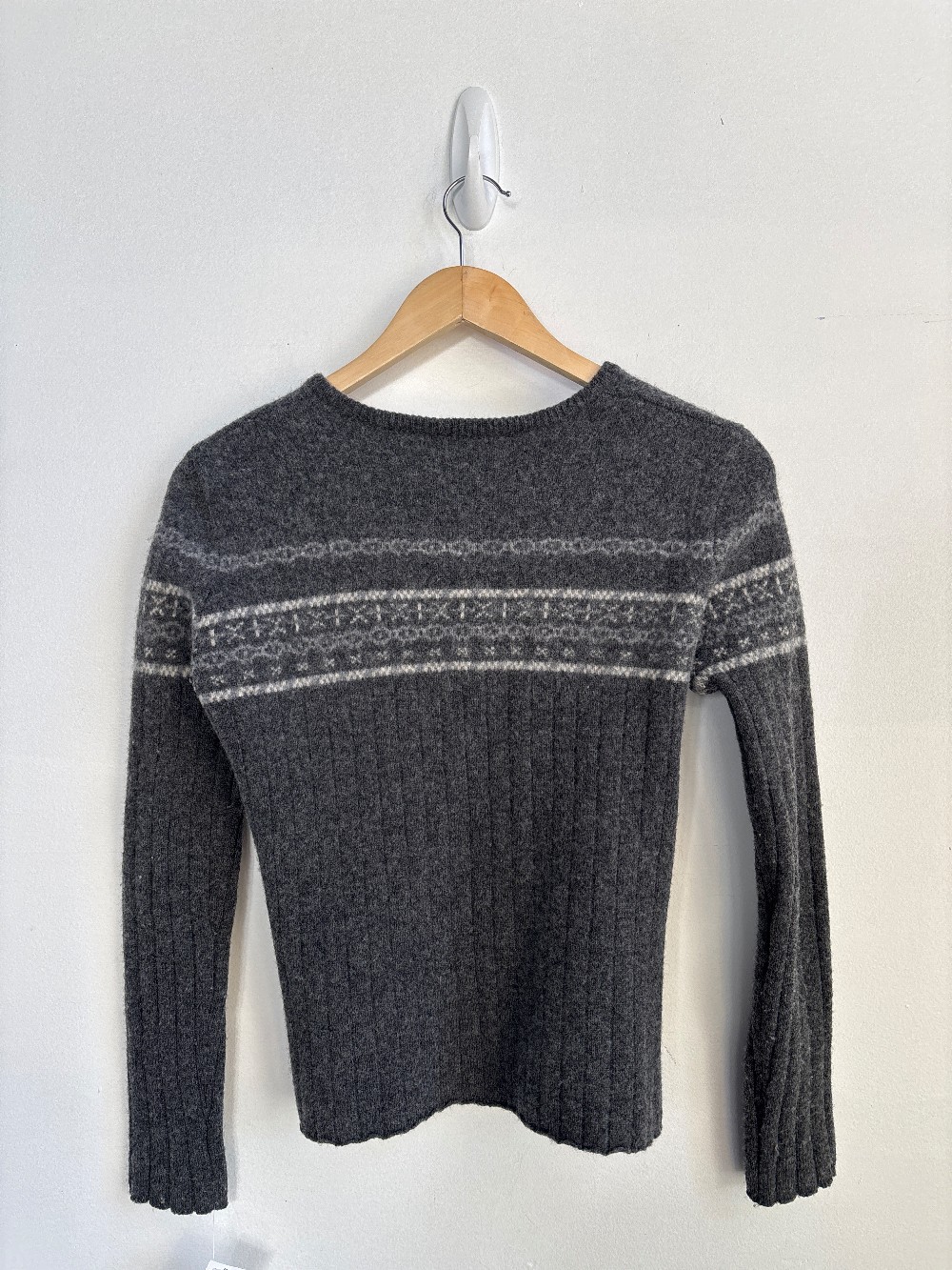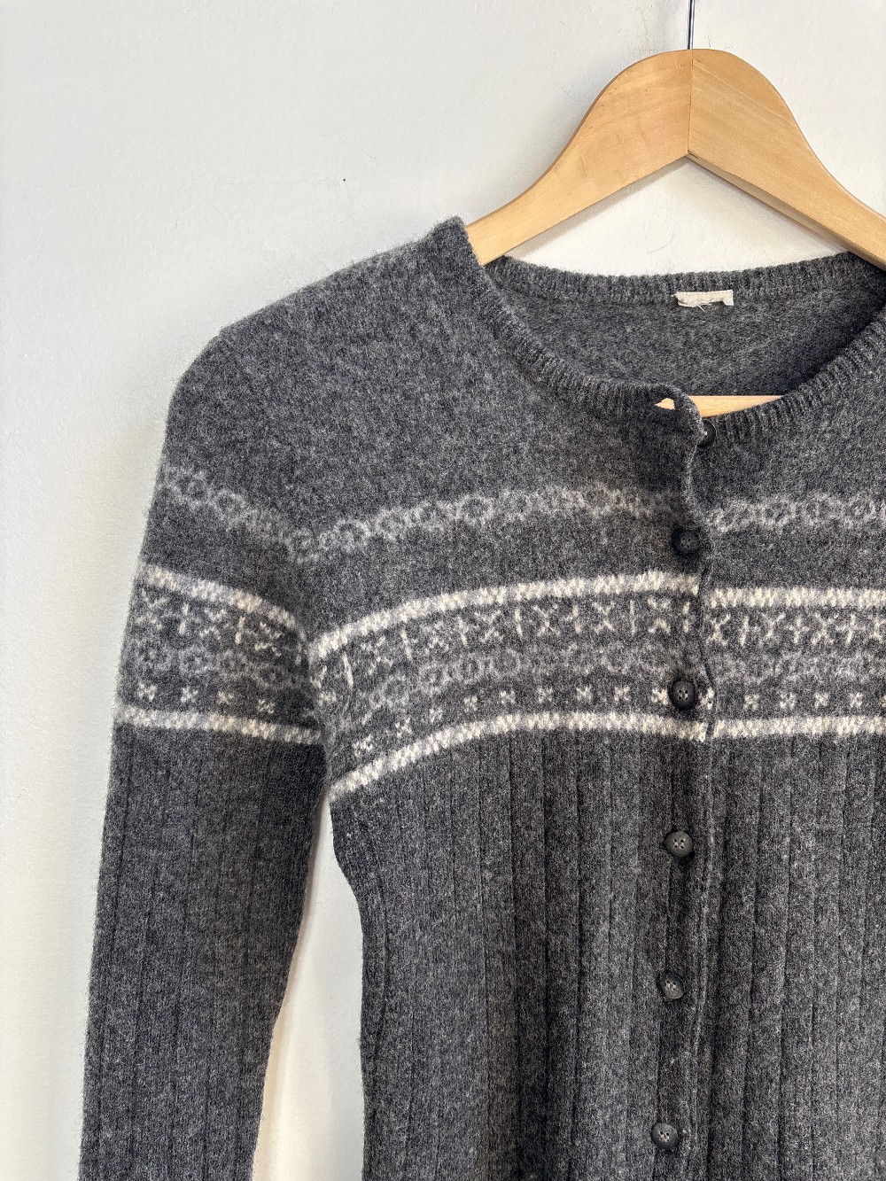 Fitted knit cardigan with a button front, ribbed body, pattern on chest and long sleeves.. Knit is 100% lambswool with lots of stretch