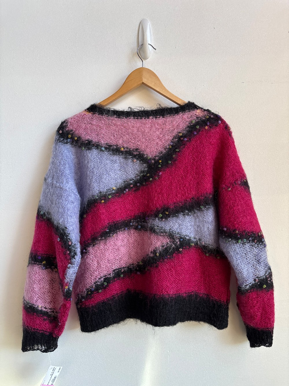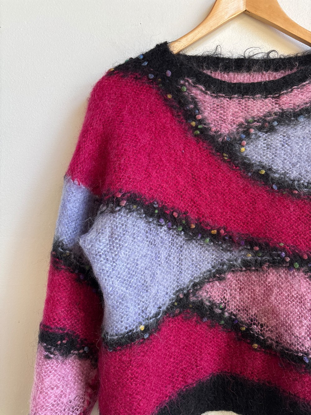 A beautiful knit mohair sweater with pink, purple, and black stripes that have multicoloured striped dots. Fits with a wide neckline, full sleeves, and a relaxed torso.