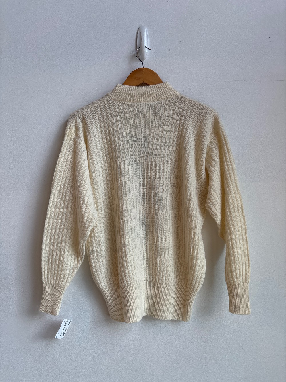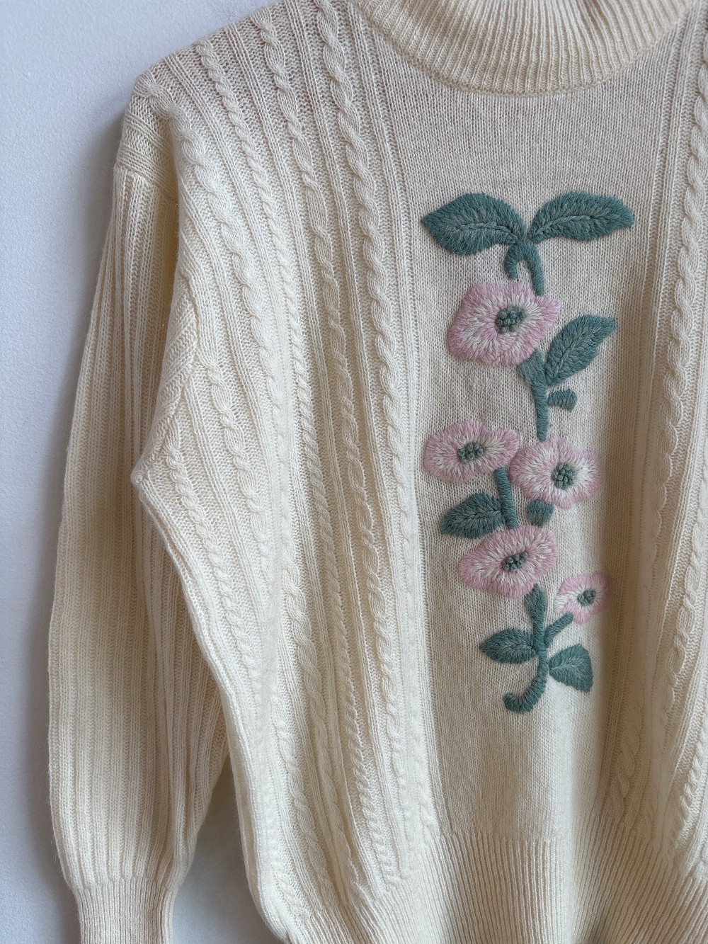 New with tags! A warm lambswool and angora blend that is cozy and comfortable. Features a beautiful pink and sage blue floral chest decal. Fits with a high neck!