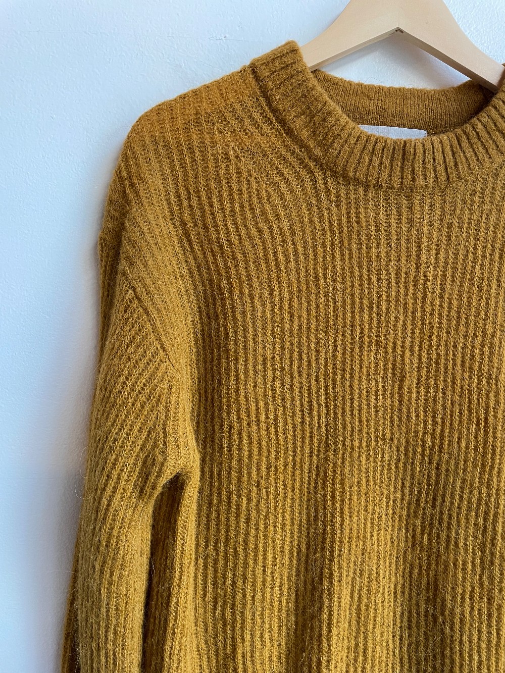 A relaxed fitting knit sweater with long sleeves, a thick collar and fine knitting. Material is alpaca/ wool/ nylon blend