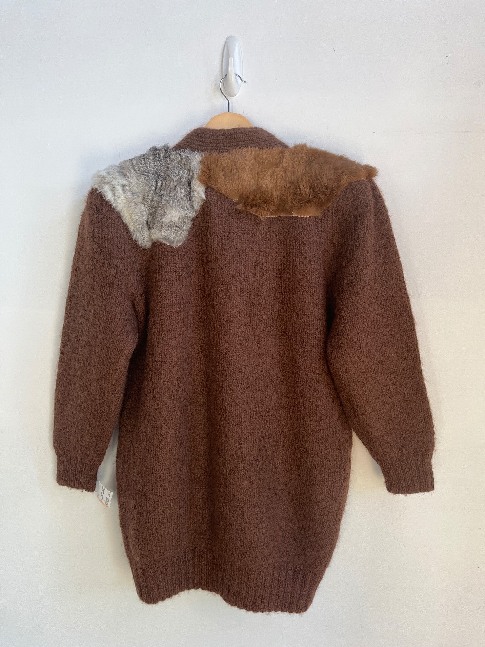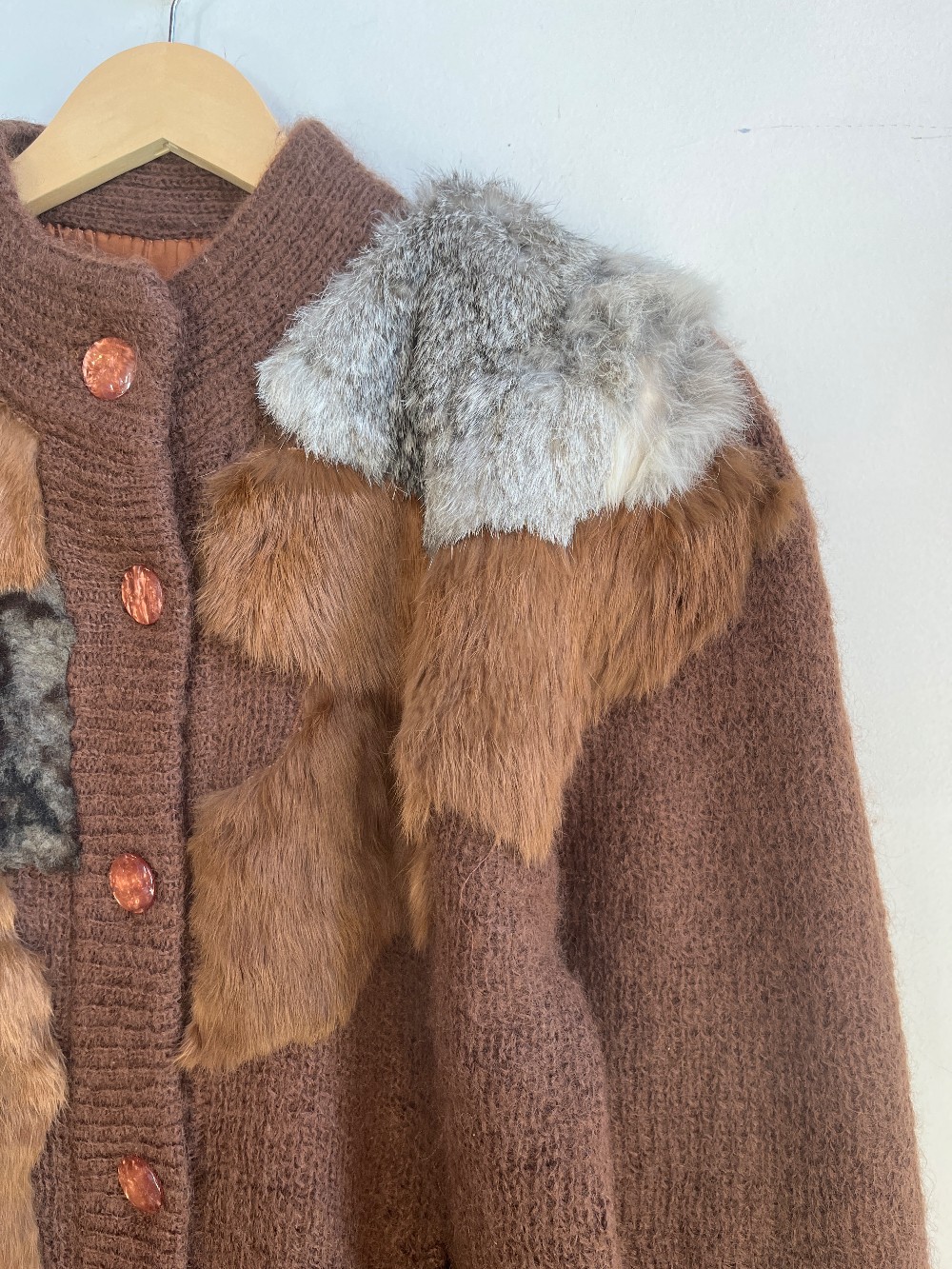 A gorgeous vintage knit button up sweater with an inner lining, high neck, long sleeves and side pockets. Multi fur patches in unique pattern on outer