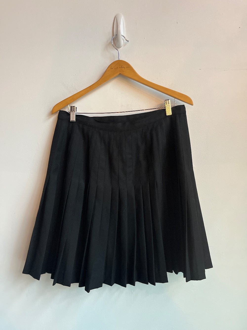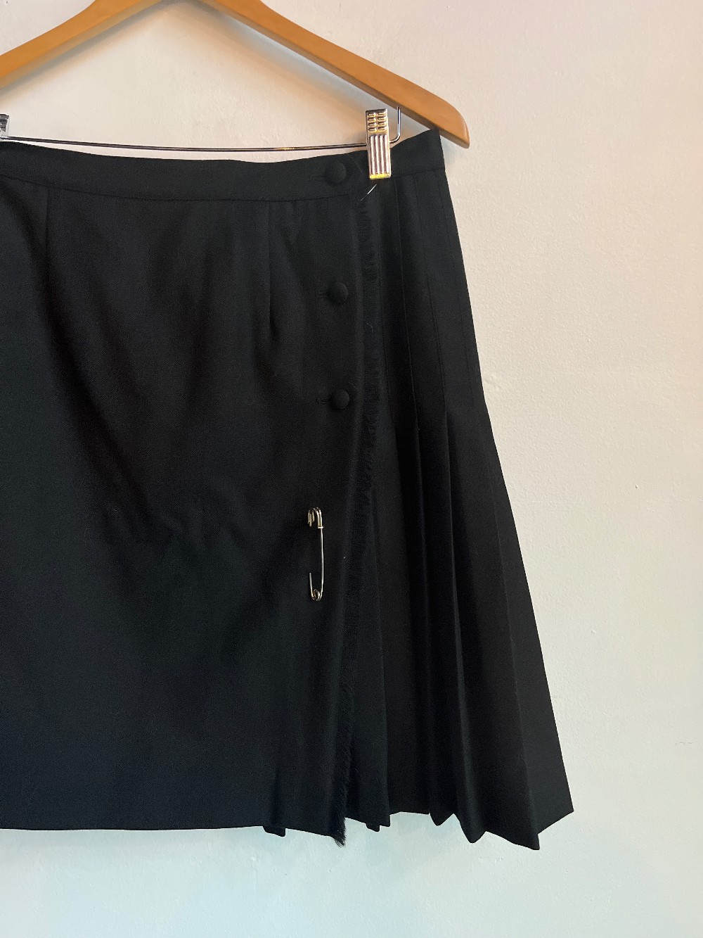 A fun black 100% wool pleated skirt with a wrap waist line and a silver pin. Features a raw outer hem and a button down waist.