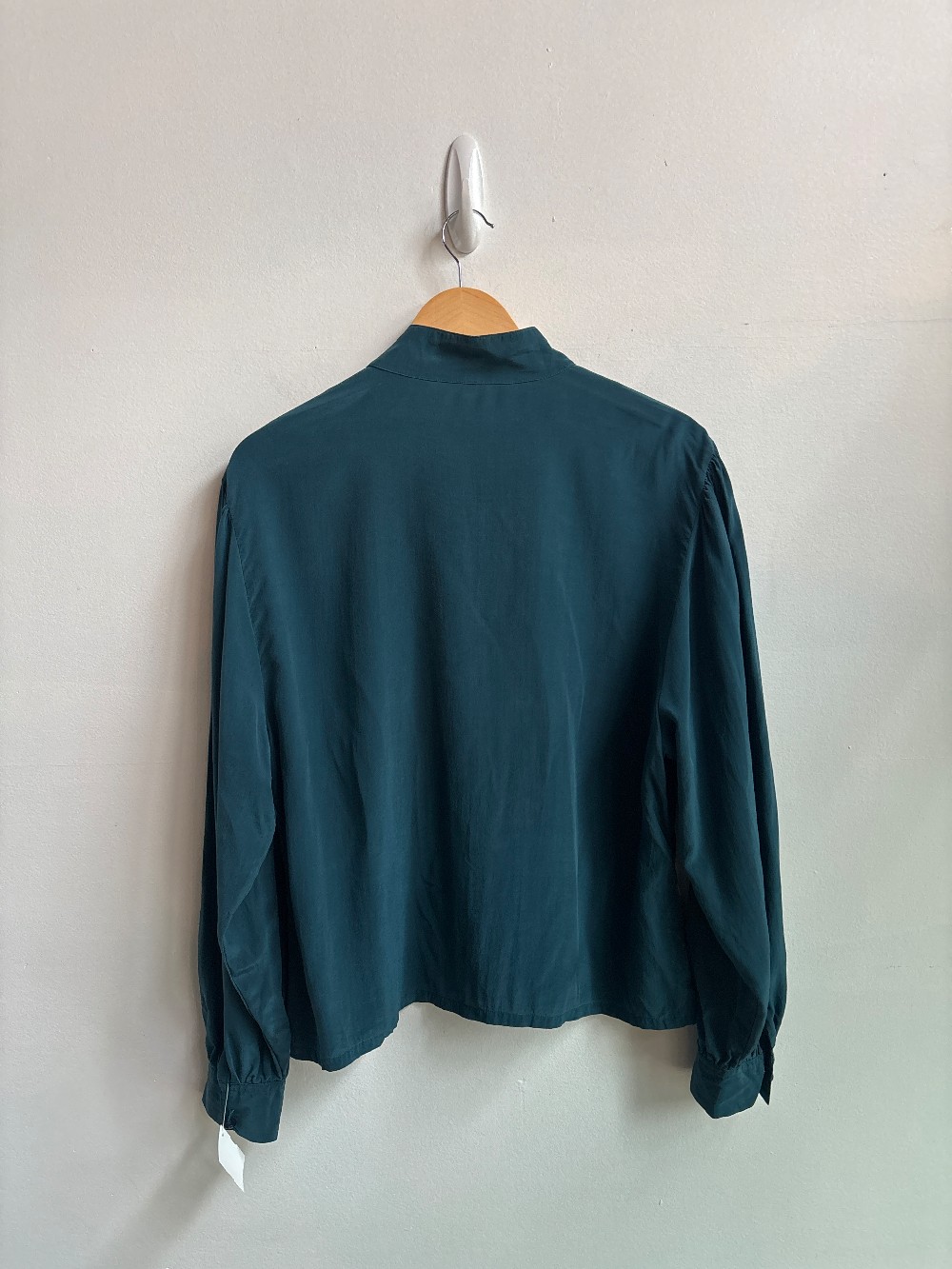 A gorgeous vintage silk blouse with an asymmetrical button front, long sleeves, loose fit and lightweight material