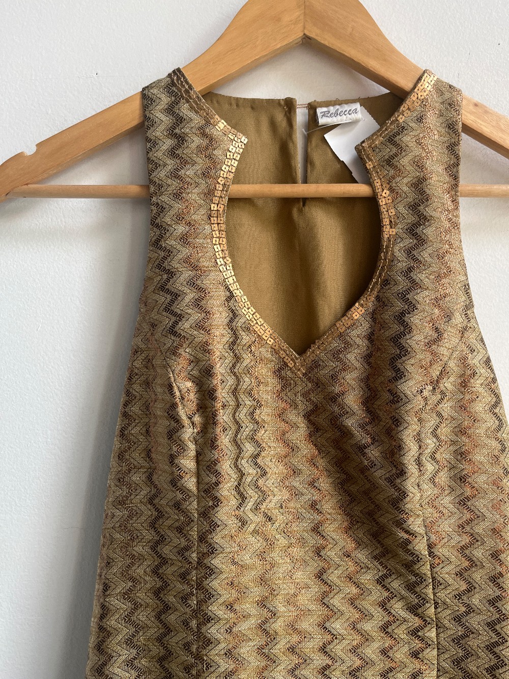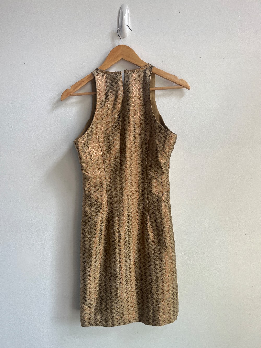 A golden striped shiny dress with a v neckline, sleeveless style, and a mini skirt hem. Features beige inner lining!
