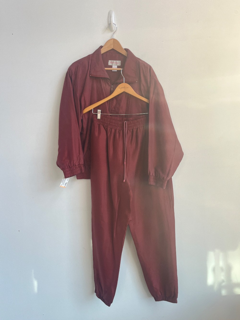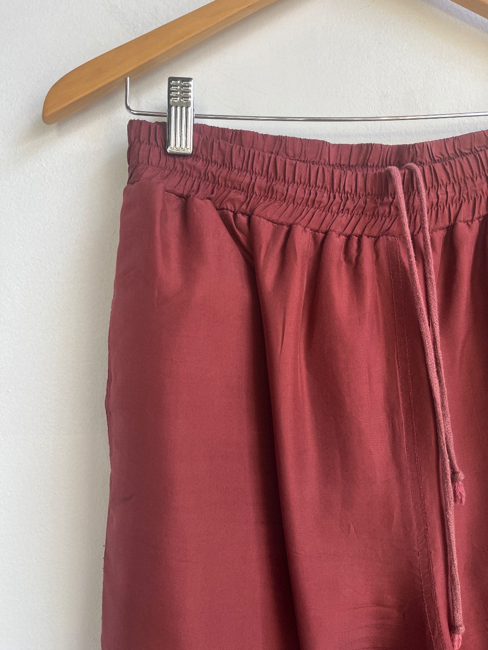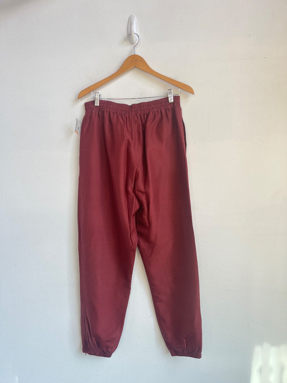 Matching jacket in store! Fun track pants made from silk, with a nylon lining, cinched elastic waist, side pockets and zip air vents at hem
