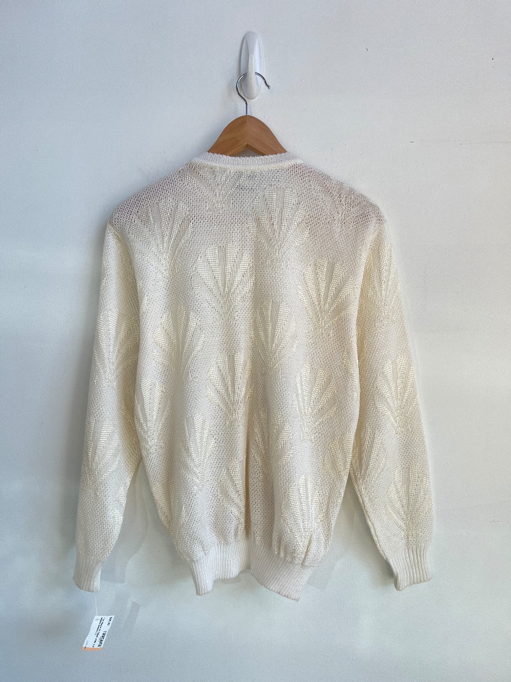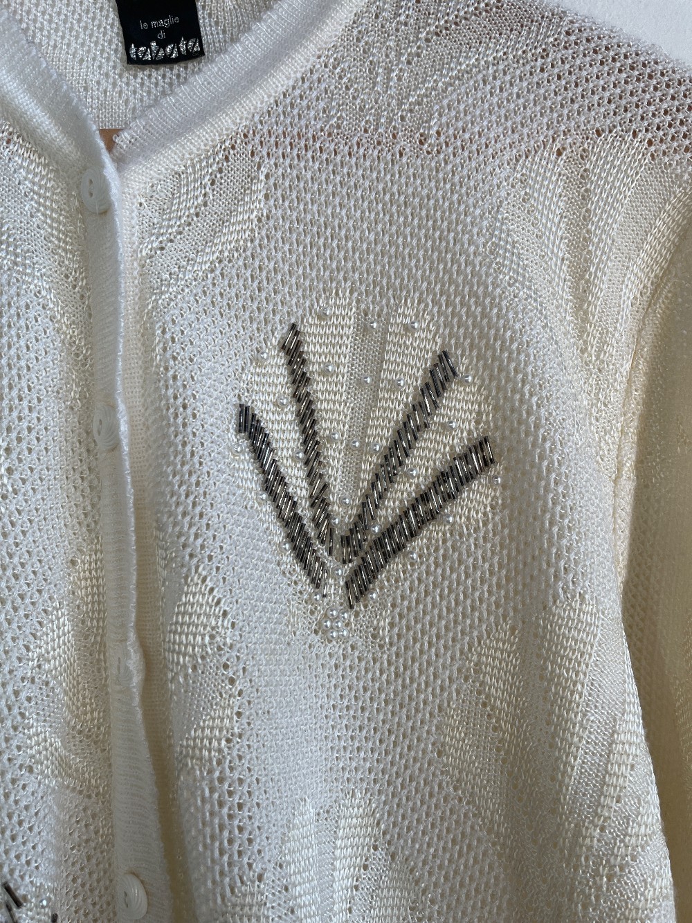 A pearl toned knit sweater with faux pearls along the chest and lower torso. Features grey tube beads. Fits with a button down front and full sleeves.