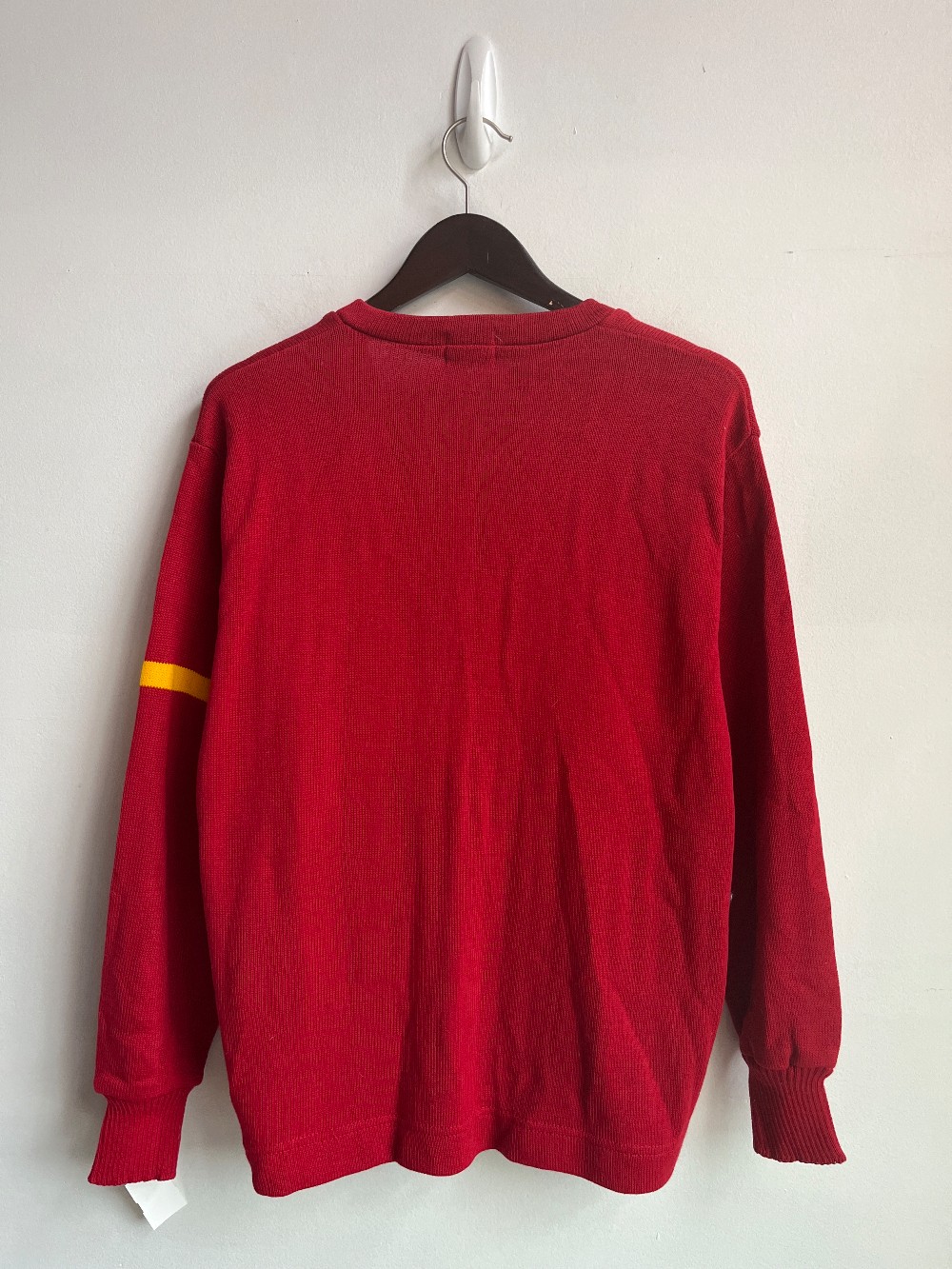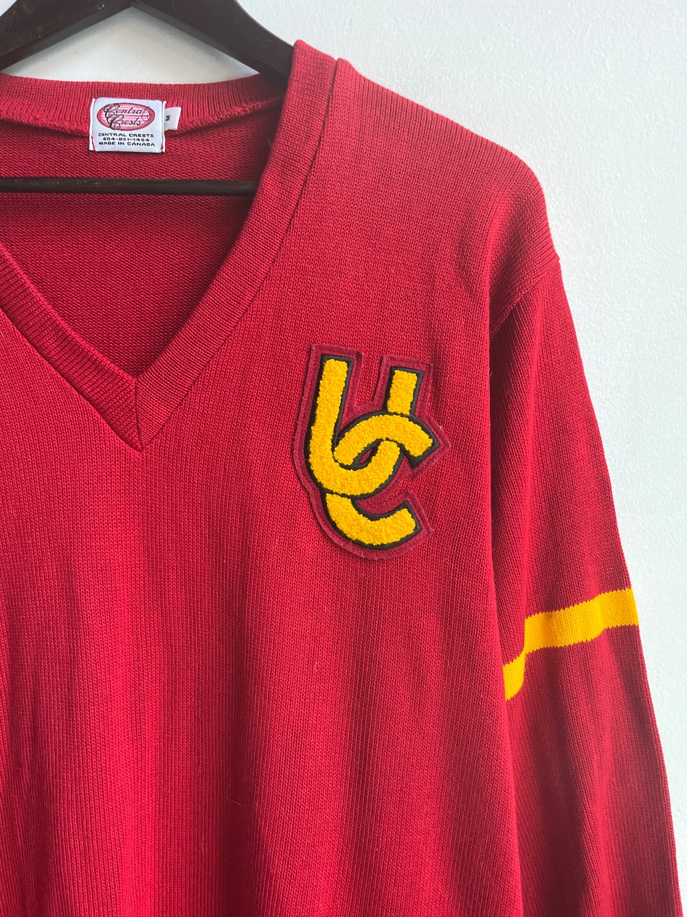 A v neckline vintage knit sweater with a yellow chest patch and stripes along the sleeves. Stretchy!