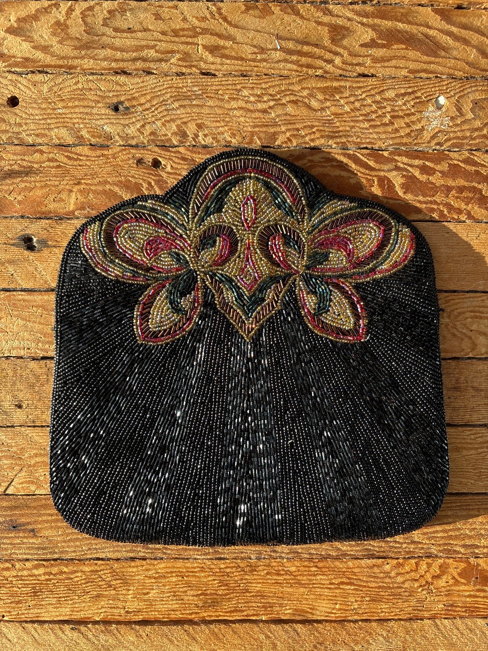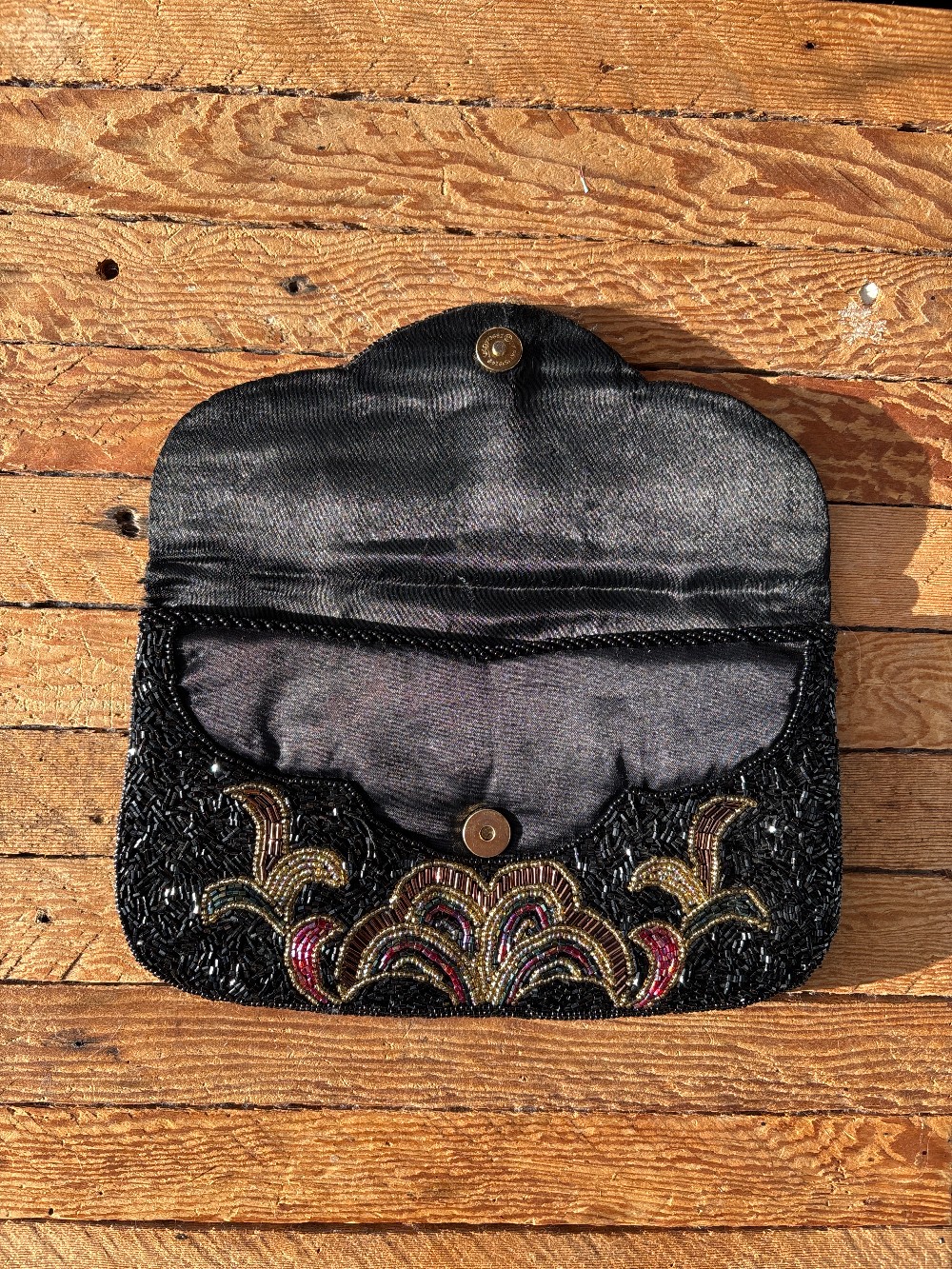 Matching belt in store! As is: minor pulling on inner lining and wear on edges, marks on inner. An envelope clutch with a magnet clasp and multicolour beaded outer