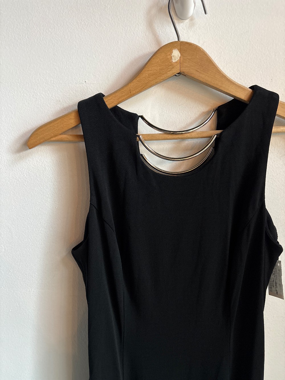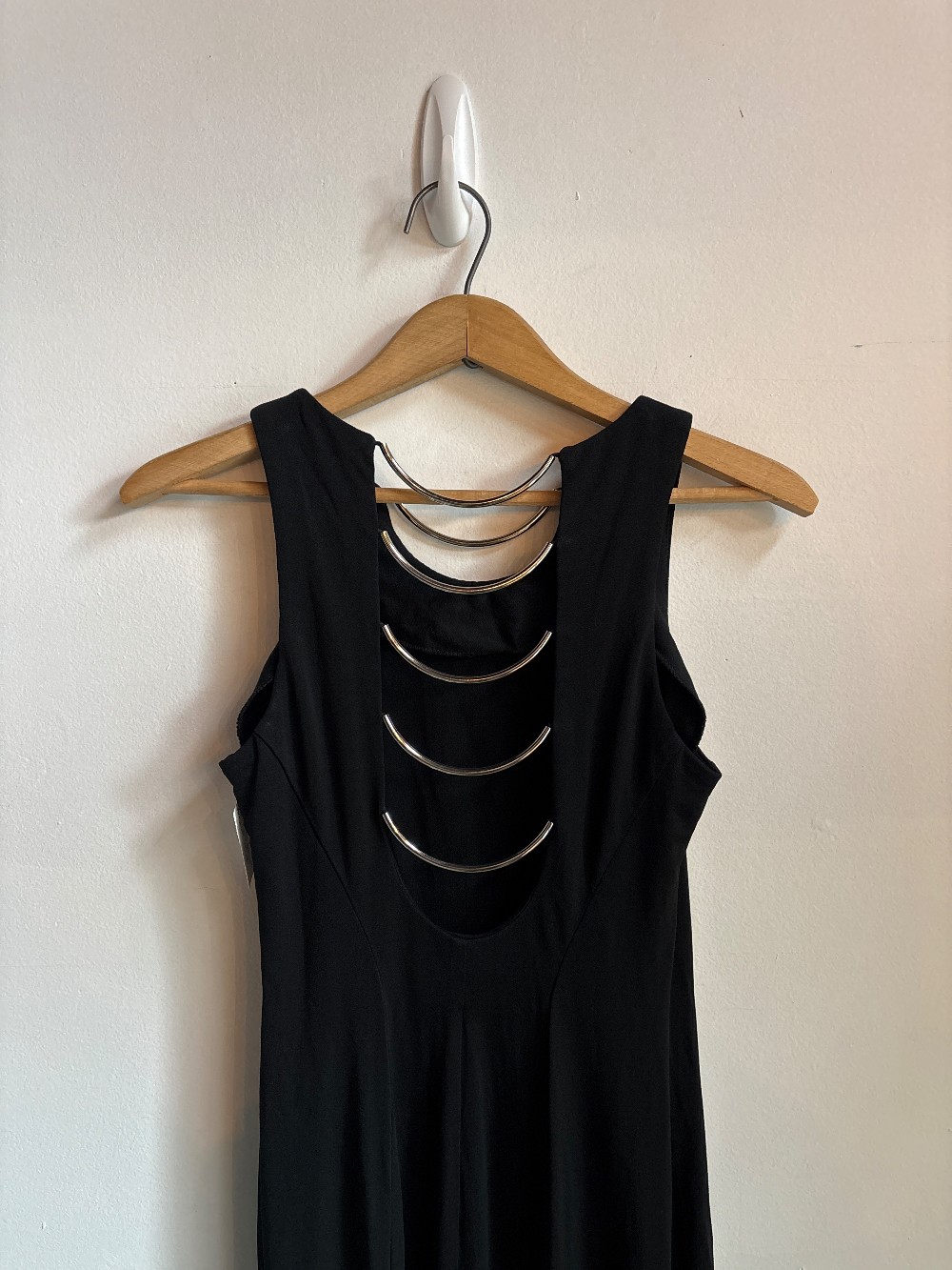 As is: slight splitting at back slit. One of a kind, vintage maxi dress with a low cutout and metal details . Fabric is stretchy, neck is high, cut is sleeveless and has a side zipper