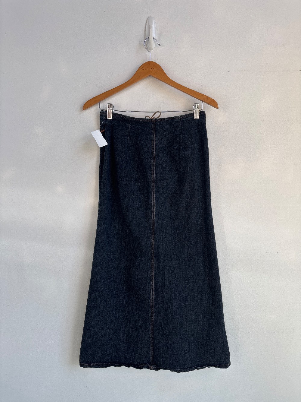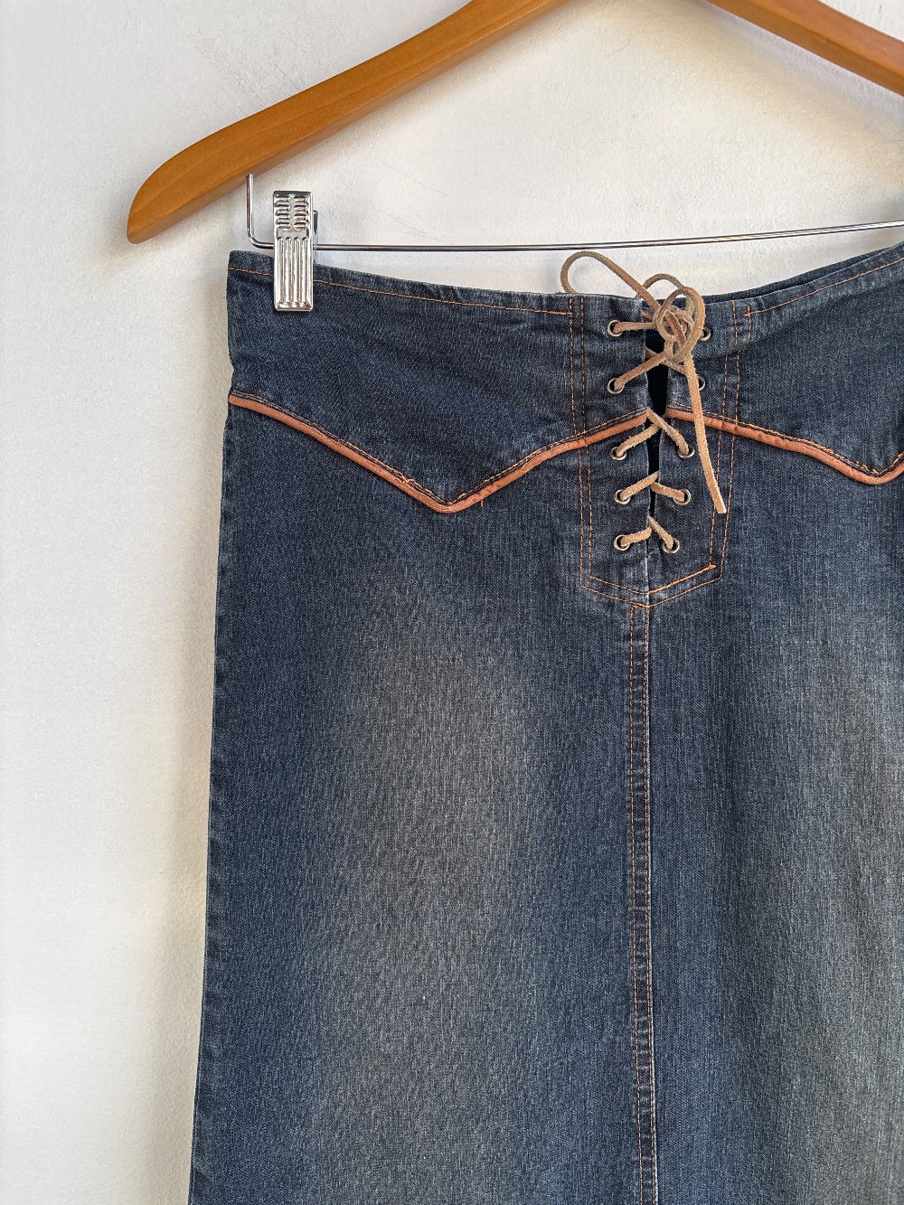 An amazing western styled maxi denim skirt with criss cross tie front and brown piped trim. Bottom is flared and fabric is a cotton/ poly/ spandex blend
