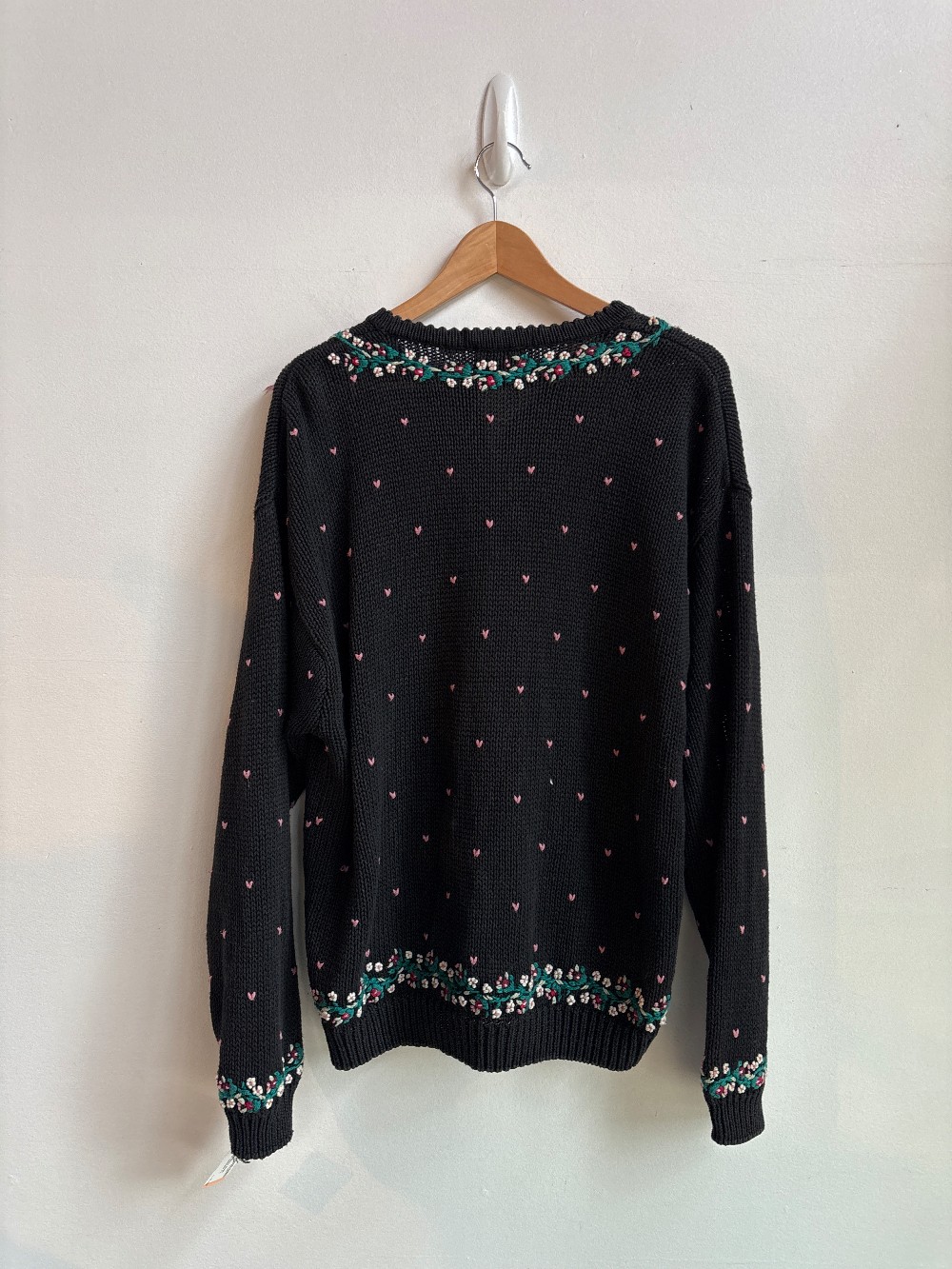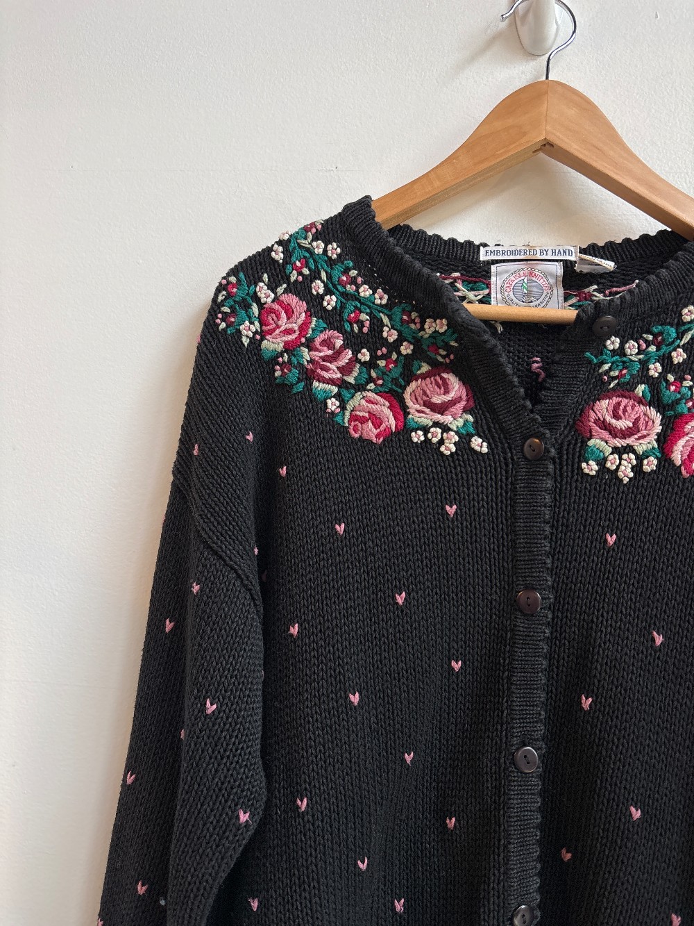 An adorable vintage knit cardigan with a high button up neck, long sleeves, black knit and embroidered florals on chest. Knit is a stretchy cotton blend