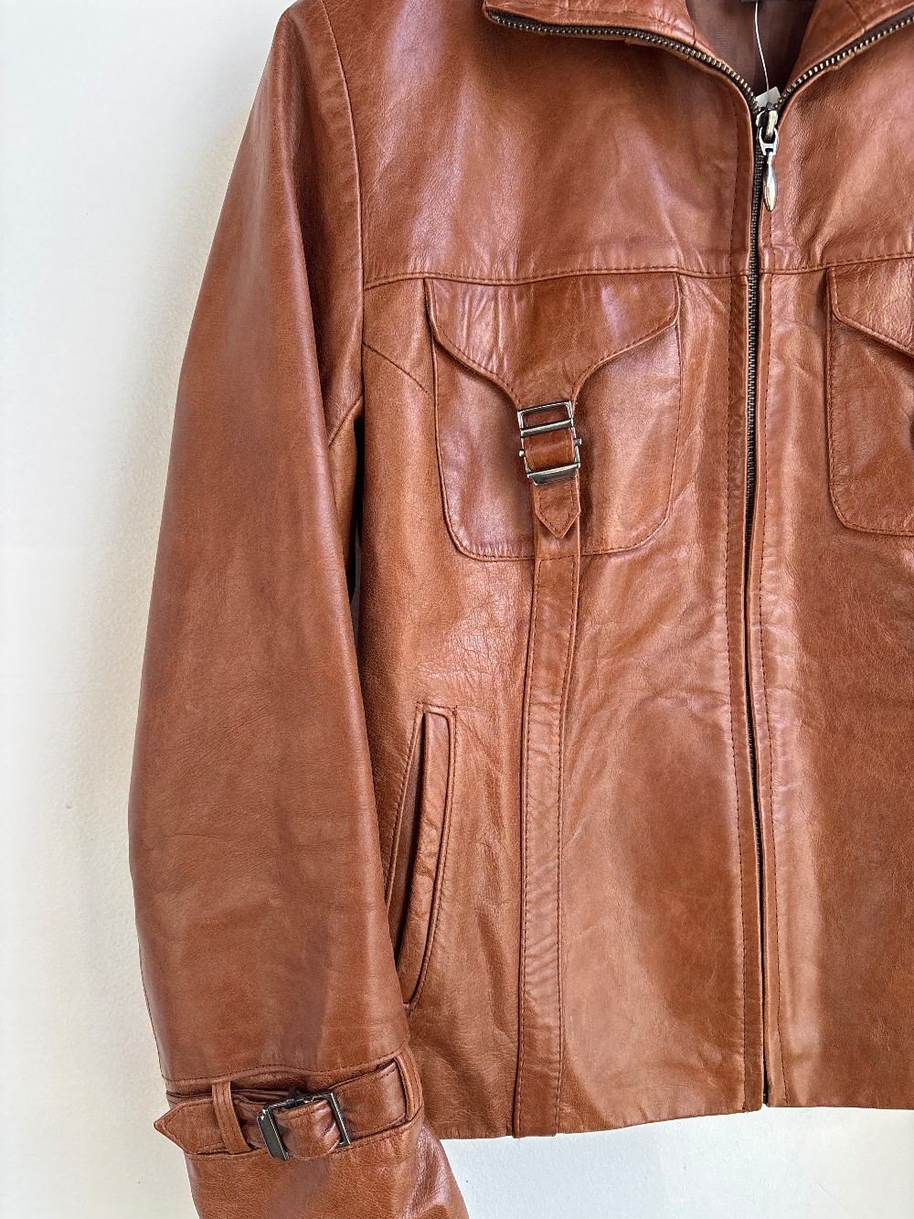 Stunning vintage brown leather jacket with a zip front and stunning buckle details on the chest pockets and sleeves.