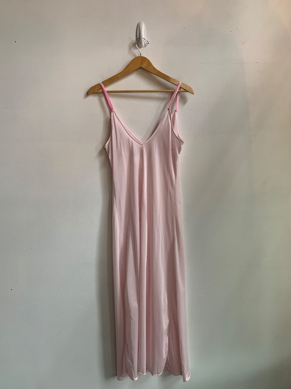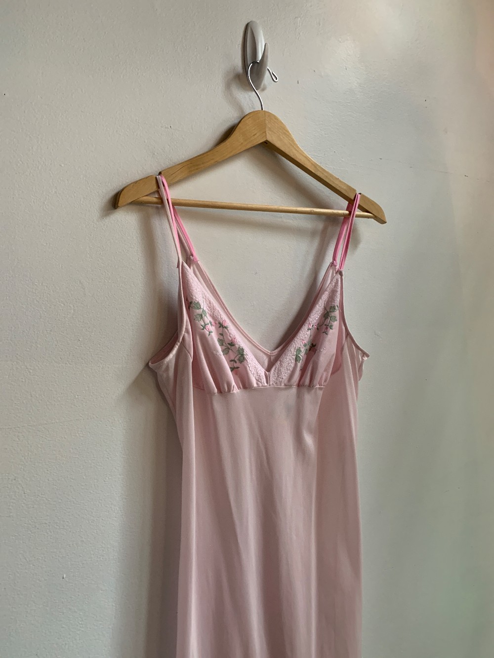 Light blush pink vintage nightgown midi length. The top features pink and green rose hip embroidery around the v neckline of the dress. The two toned pink spaghetti straps are not adjustable but lay over the shoulders. This elegant piece can be down or up. A unique piece to have in your wardrobe!