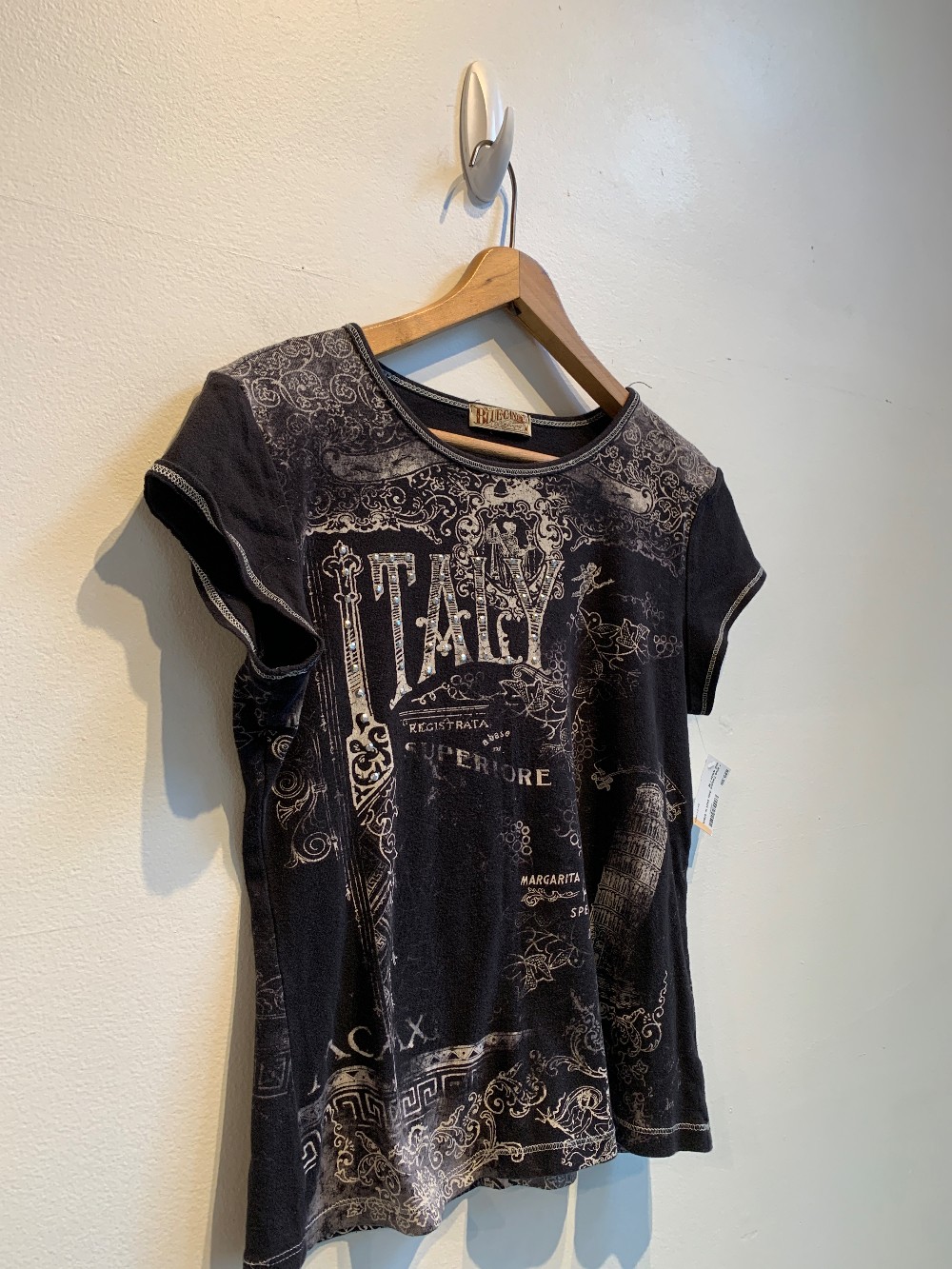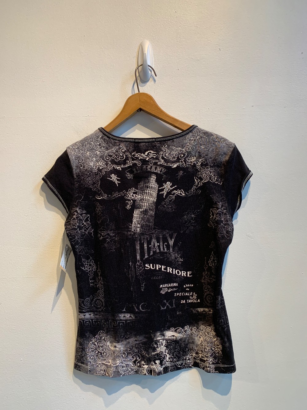 Y2k Blue Canyon black tee with white pattern and “ITALY” text print in white with gemstones.
