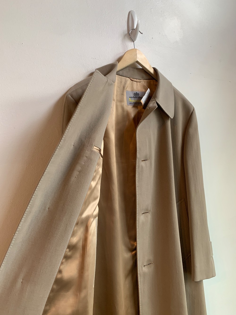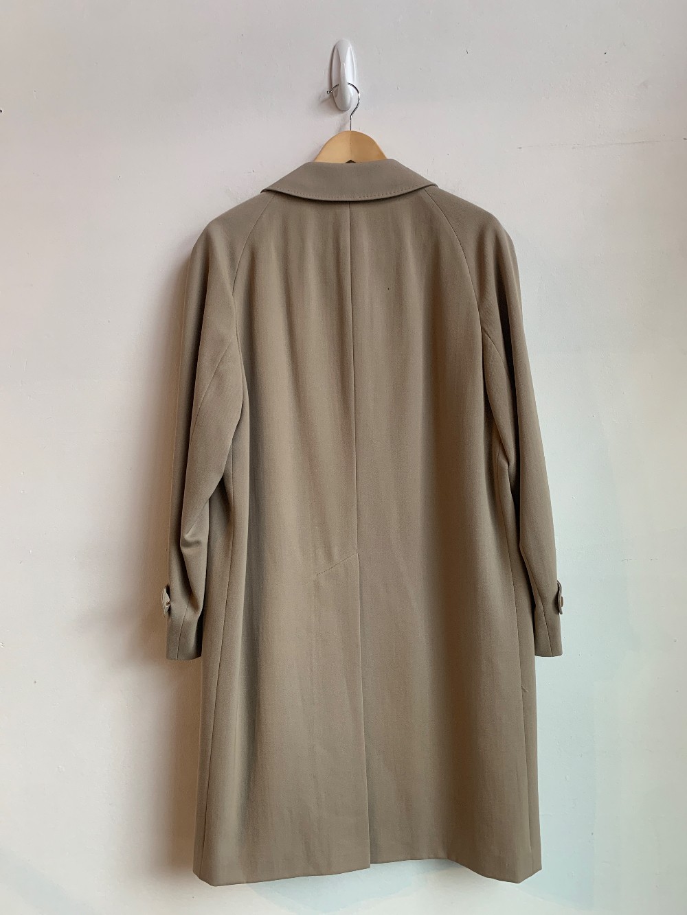 Aquascutum was the first to create a wool fabric that was waterproofed at the yarn-making stage, rather than coated on the surface. This classic styled trench has a full satin inner lining with a button front closure, inner and outer pockets and a pointed collar.