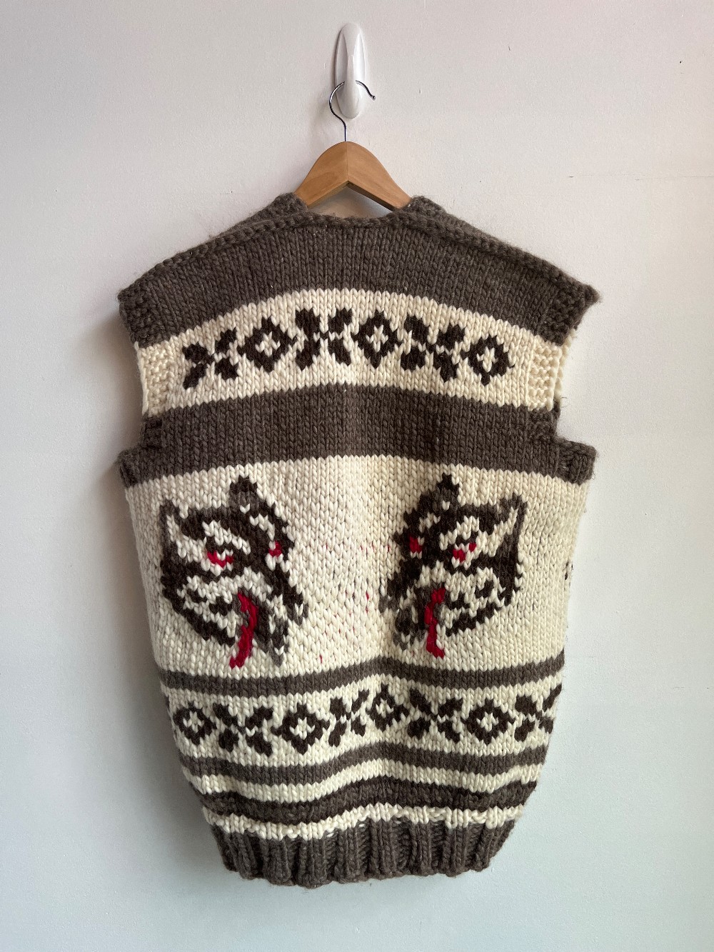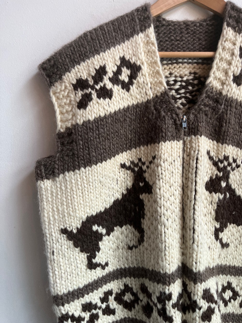 Would fit Large-Xlarge best. A super soft hand knit vest with a vintage YKK zipper, a boxy fit, V neck and reindeer motifs on front and wolves on back. Made from a thick and soft yarn that feels like wool blend