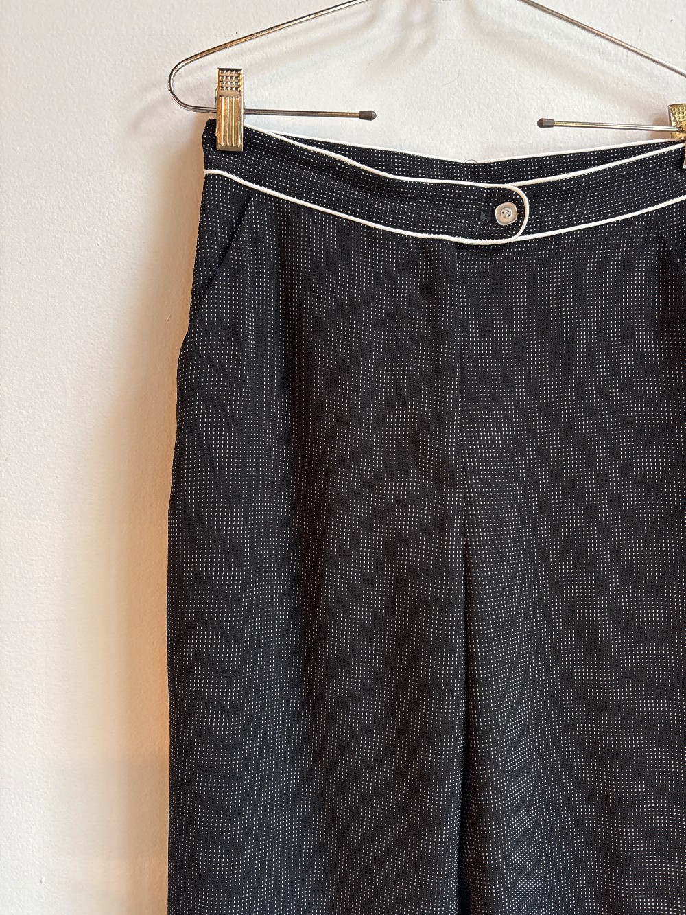 Gorgeous wide leg vintage pants with a high rise. Has a zip fly and front hand pockets. has white detailing around waist and fully lined inner.