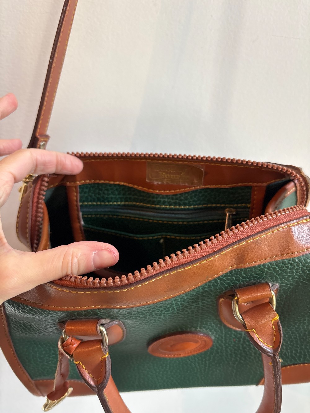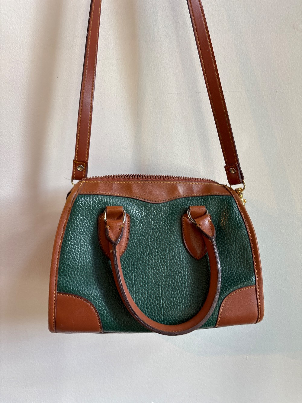 Dooney and Bourke are known for their simple preppy bags. The classic style works really well with all of the Americana looks going on right now. The iconic duck logo is a true mark of taste. The deep forest green and camel colors are neutral and super versatile, so they go with pretty much all warm tones.
