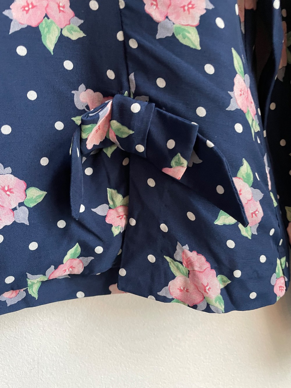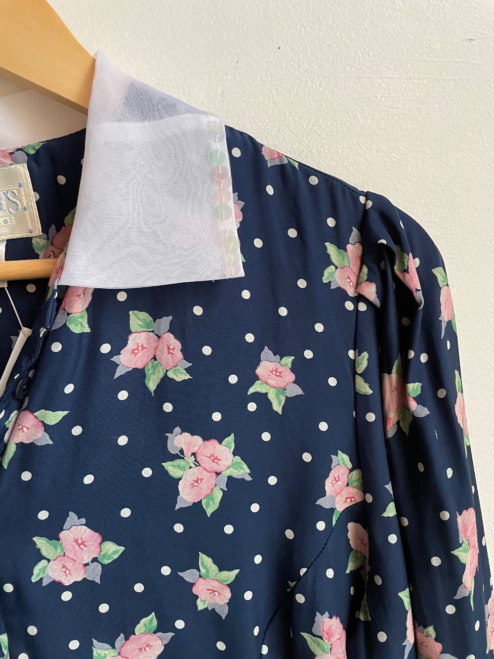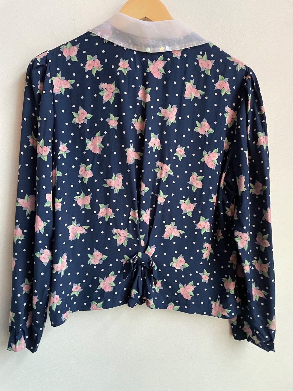 A unique fusion of polka dot and dainty pink florl print. This navy blue button up top features a sharp collar with sequin lined edge.