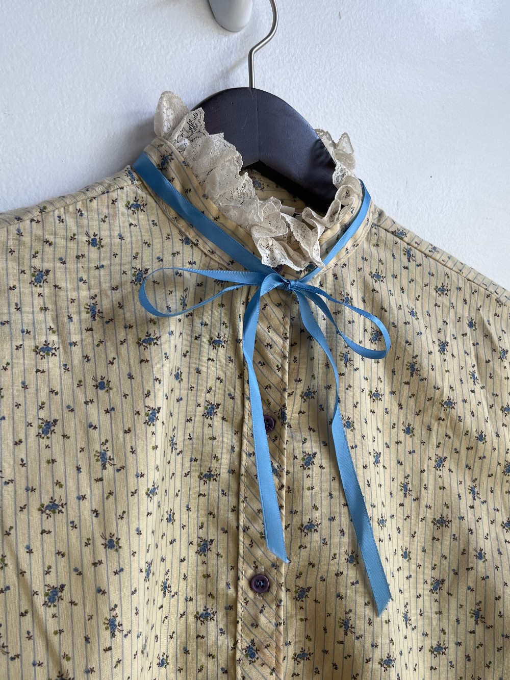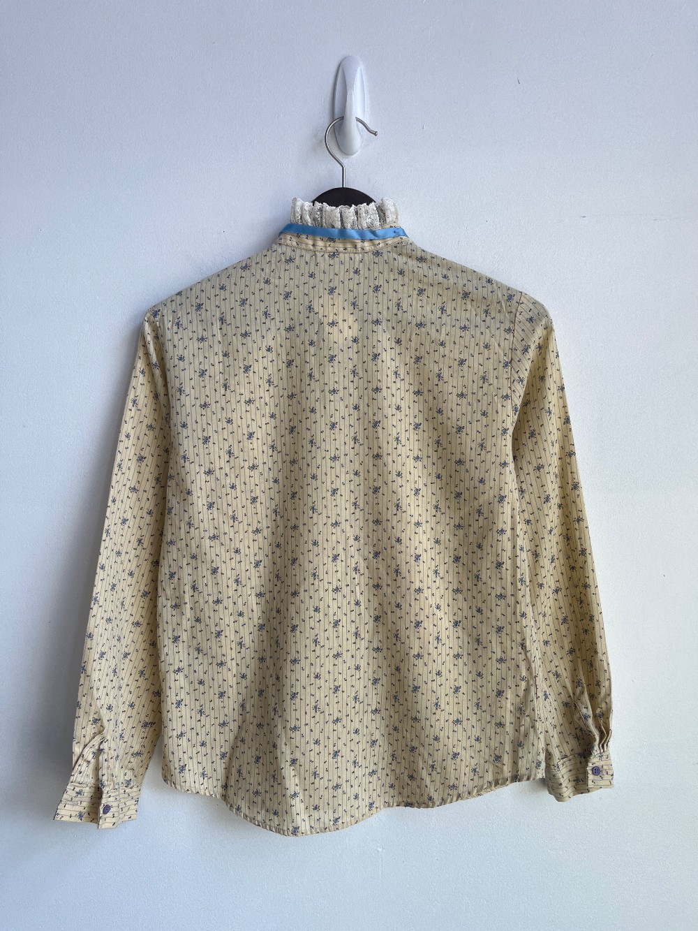 Vintage from the 70s! A darling blouse with yellow fabric that has blue pinstripes and dainty florals throughout. Features a white lace neckline and a blue ribbon along the back. Has a button down front and a relaxed torso fit. Made from and poly and cotton blend.