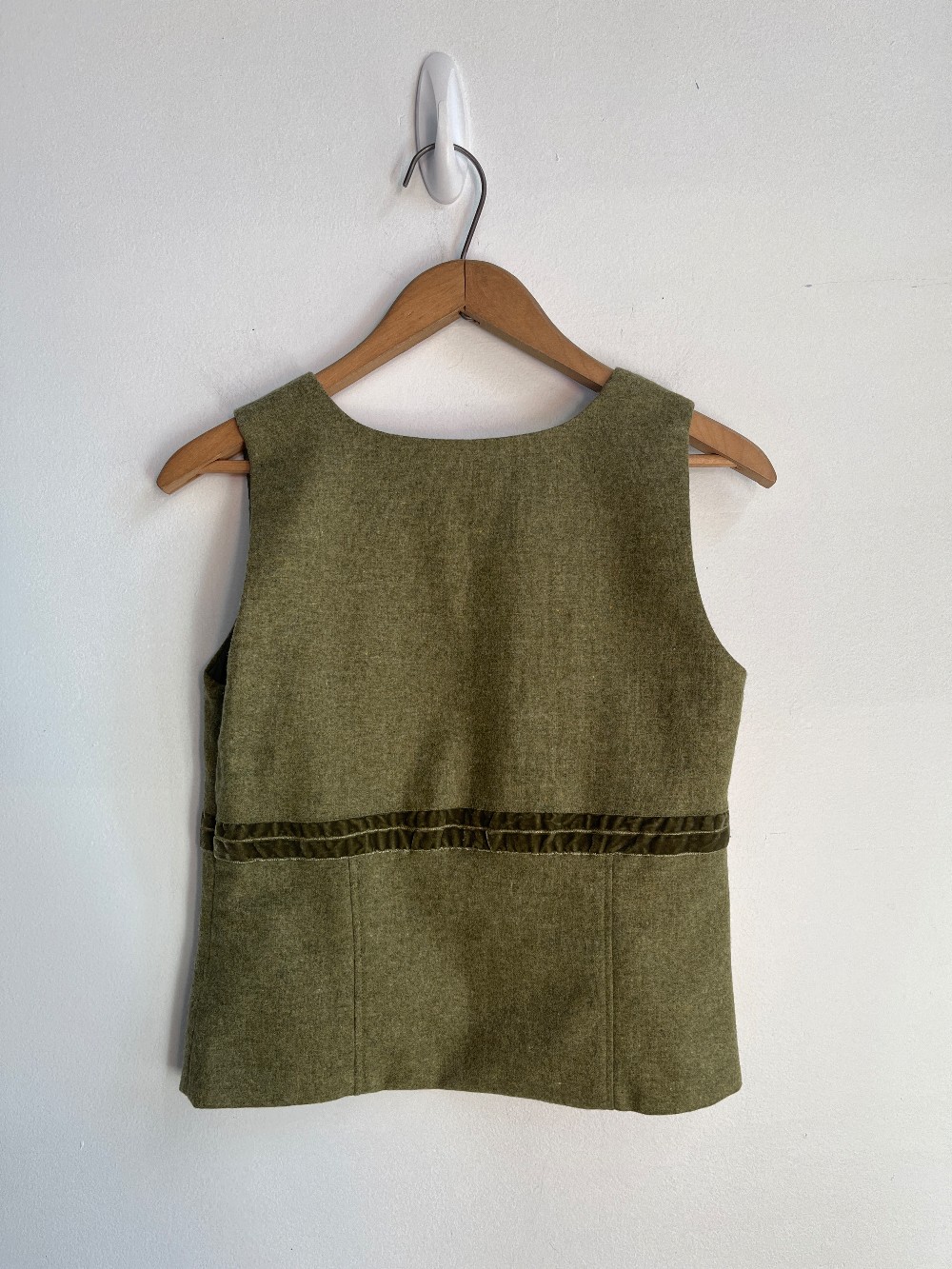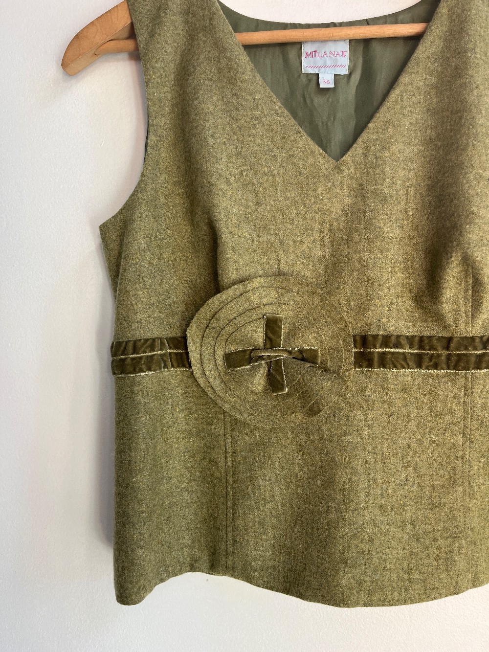 Vintage, made in the Czech Republic! A moss green wool tank top with a floral appliqué and velvet trim. Features a sage green inner lining.