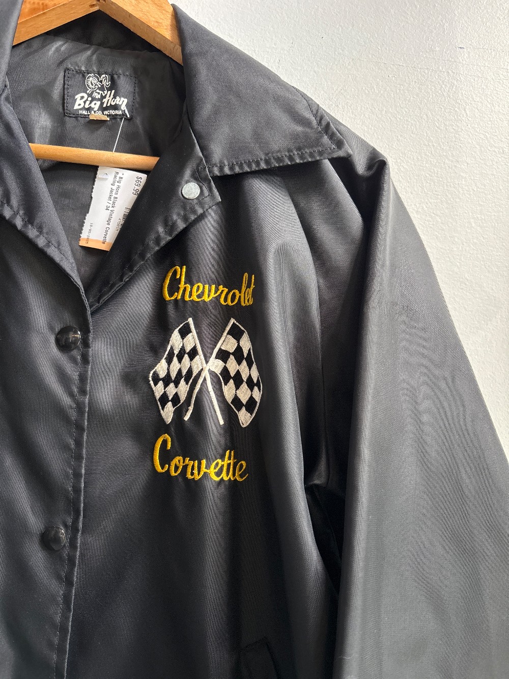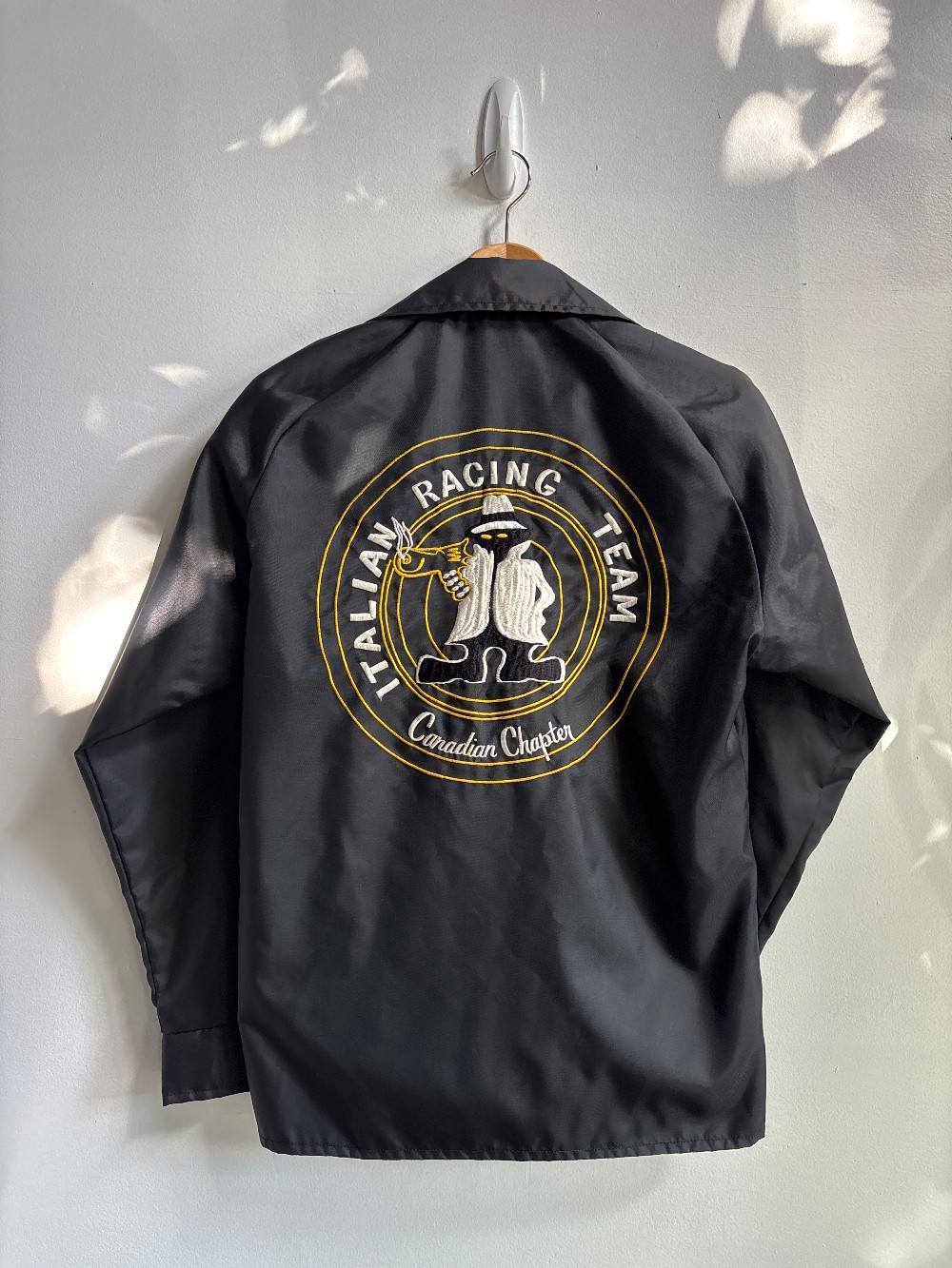 Sweet lightweight vintage racing jacket with a snap button front and embroidered detailing on front and back. Has front slash hand pockets and a pointed fold over collar.