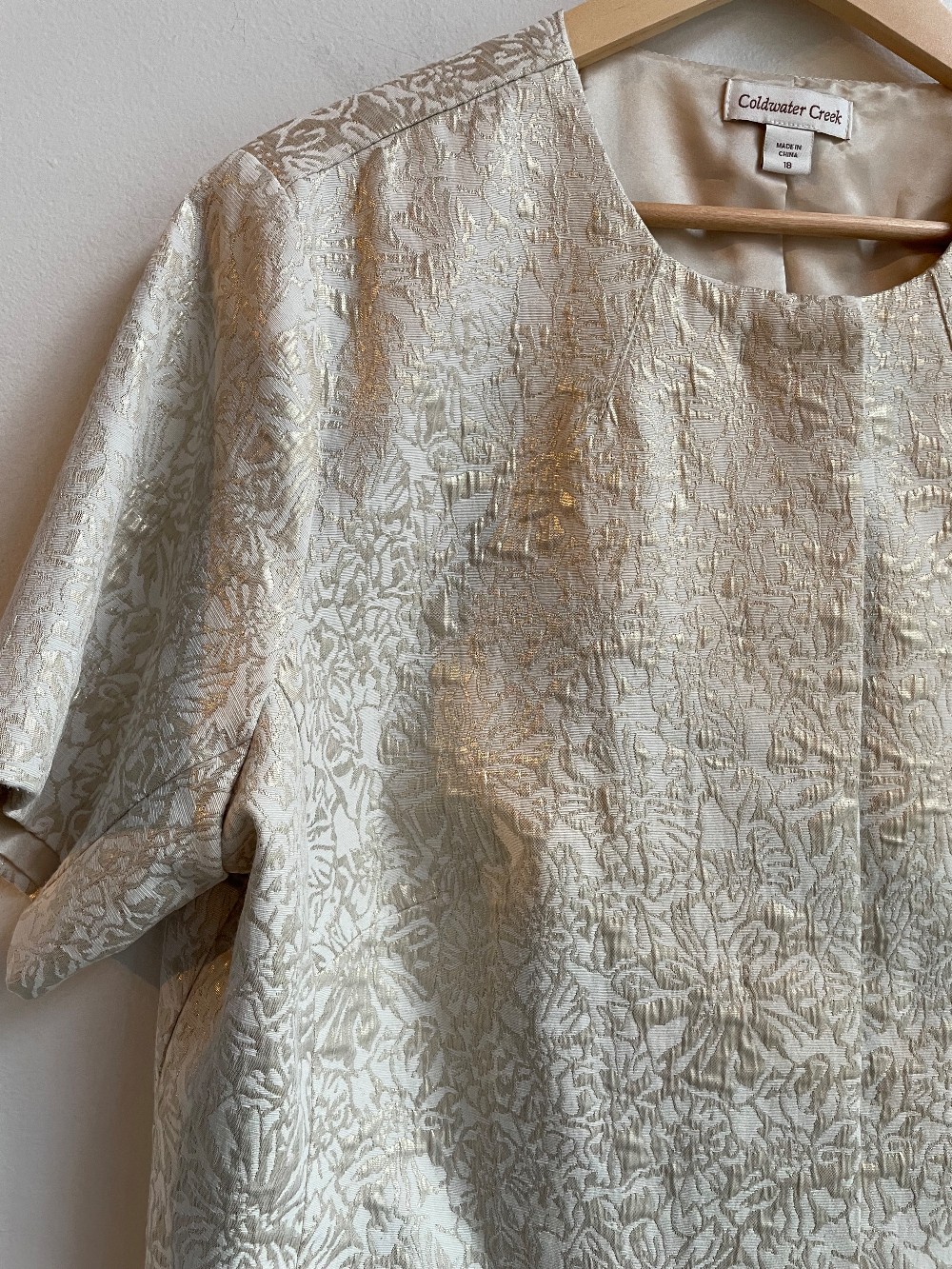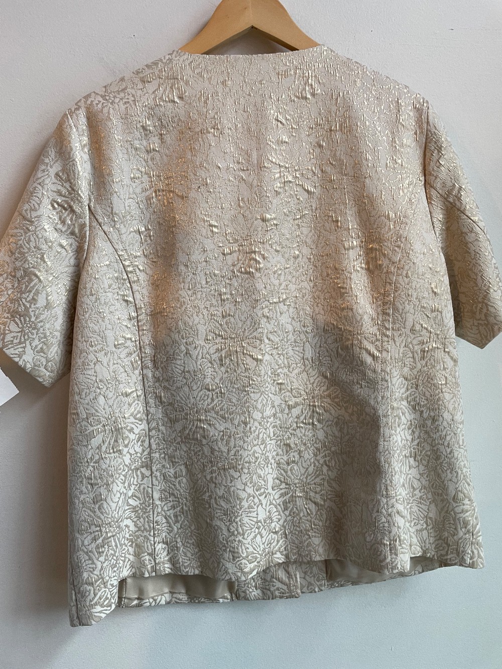 A shiny champaign sheen with floral jacquard print and a boxy quarter sleeve style. features a hidden button down front.
