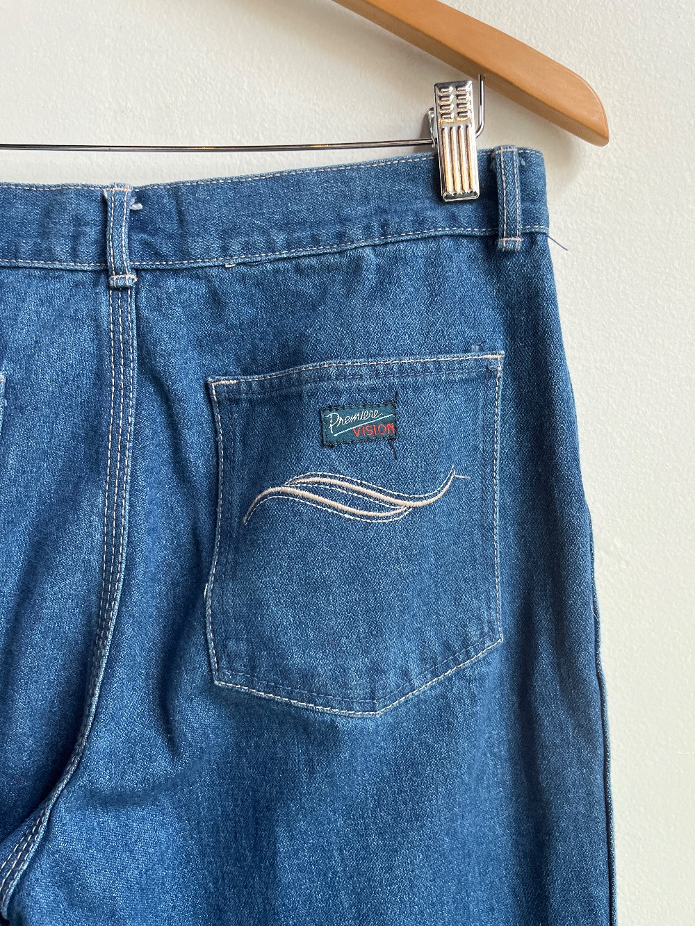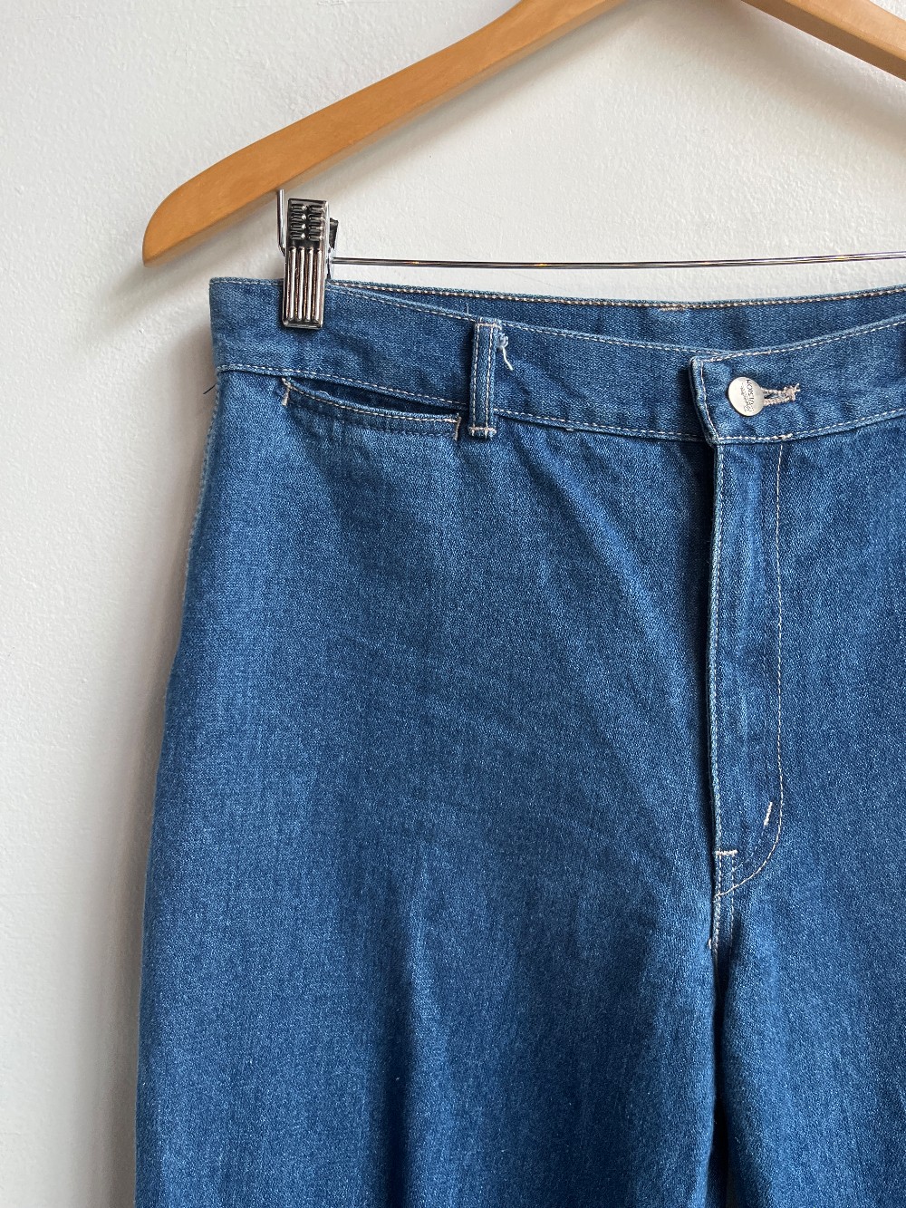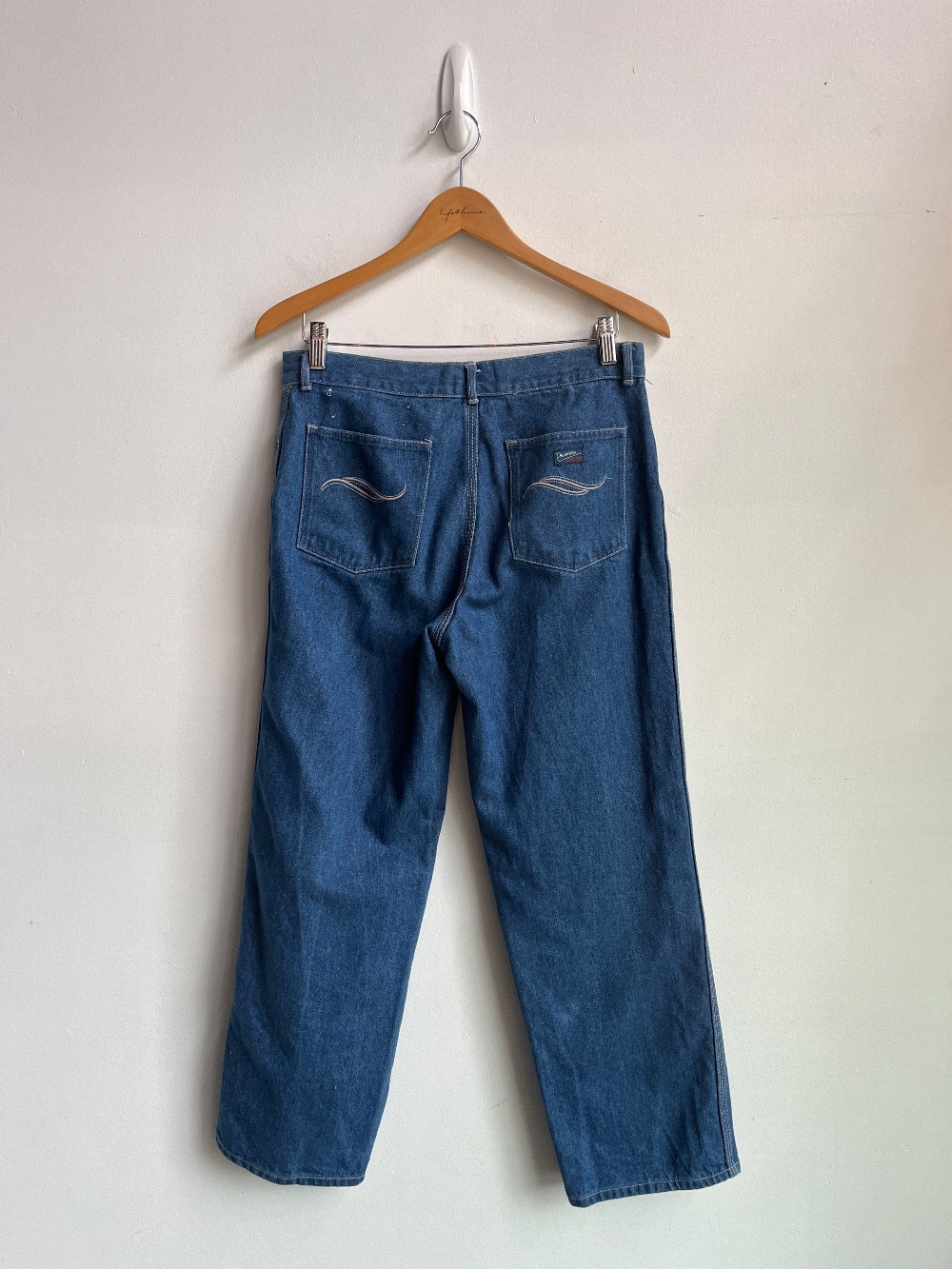 Approximately 31 inch waist, measured 15.5 laid flat. A soft and flexible pair of vintage jeans with the perfect worn in shape. Features a zip fly, belt loops, and two back pockets.