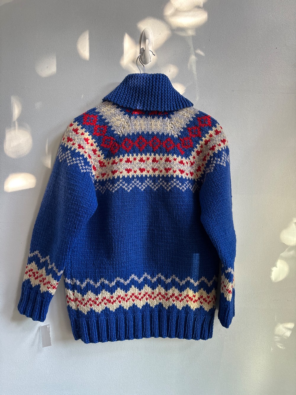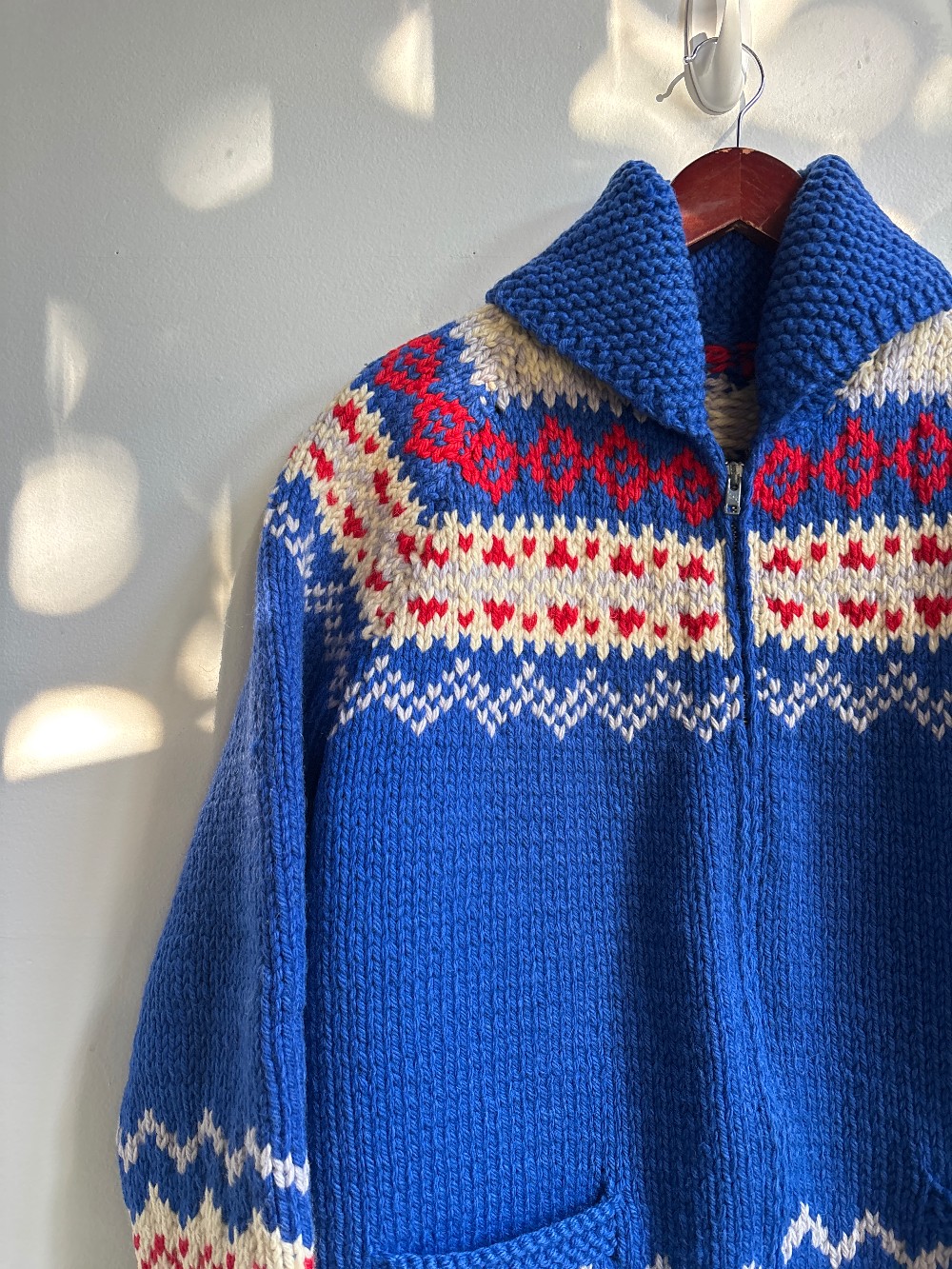 Would fit Large best. A gorgeous blue, red and cream hand knit sweater with a zip front, small front pockets and fold over collar. Cowichan styled design.