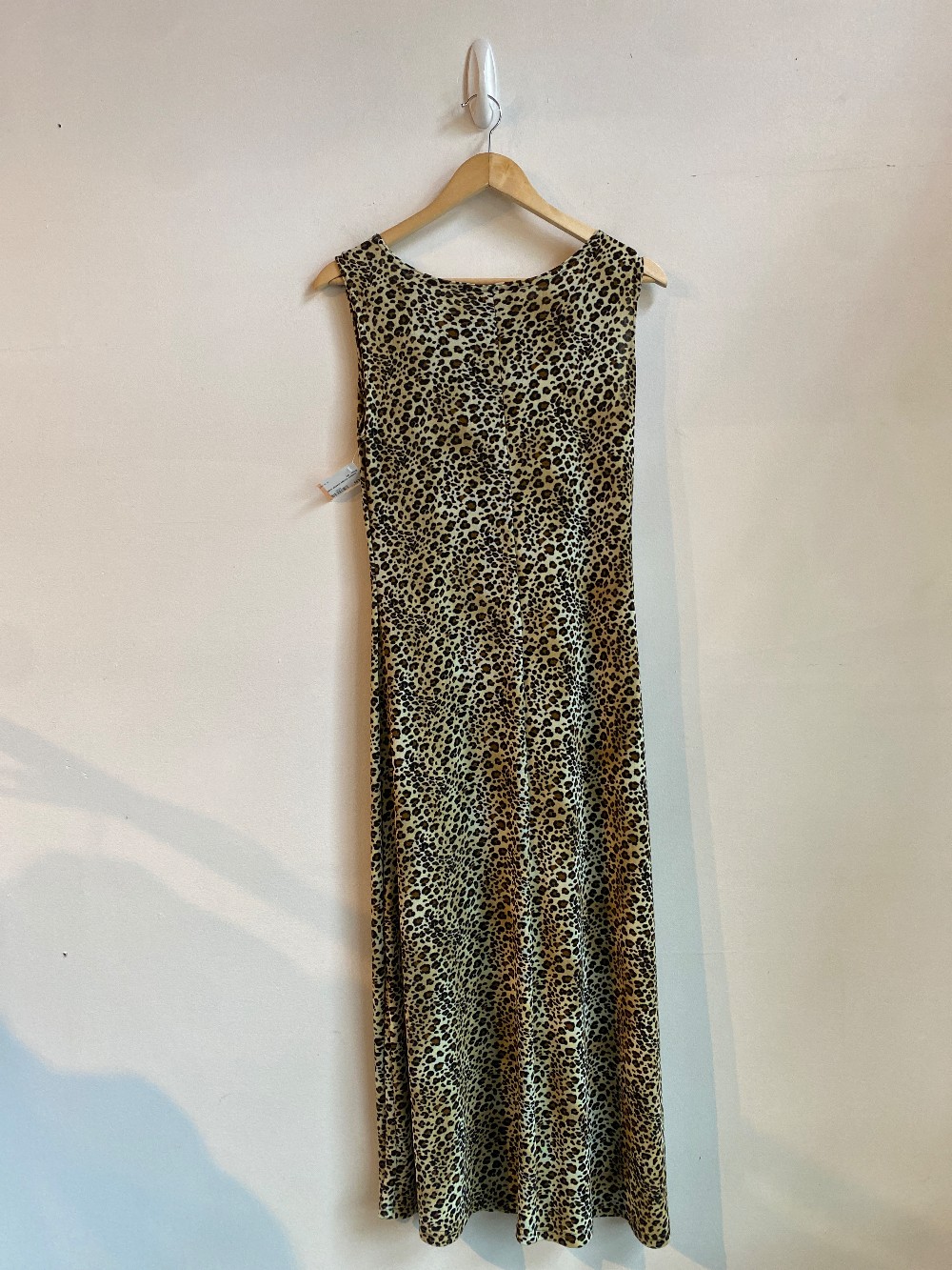 Would fit medium-large best. A sleeveless maxi dress with a high boat neck and straight fit. Fabric is stretchy and slinky.