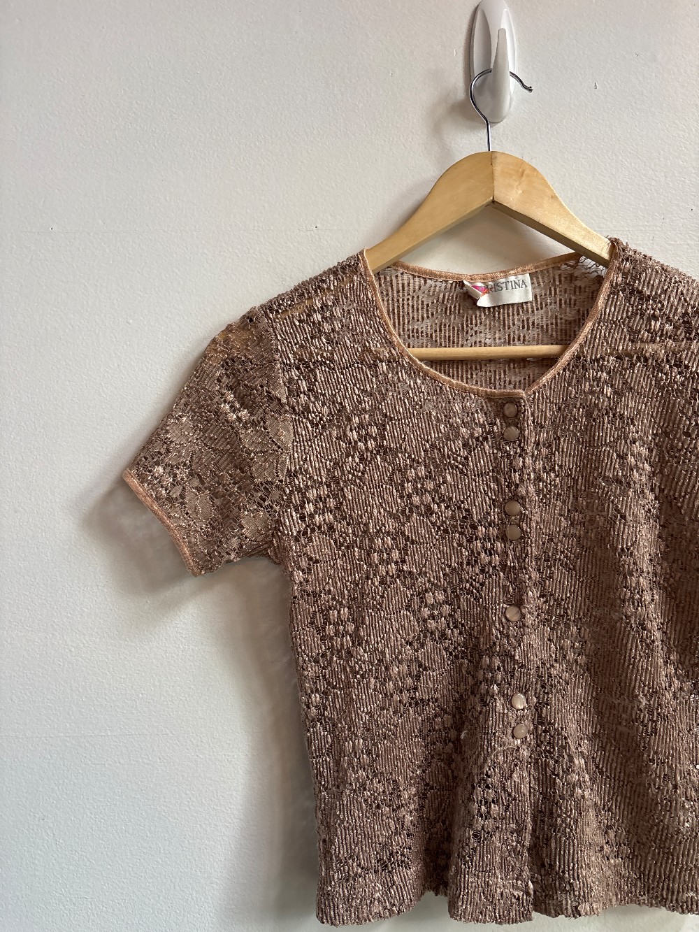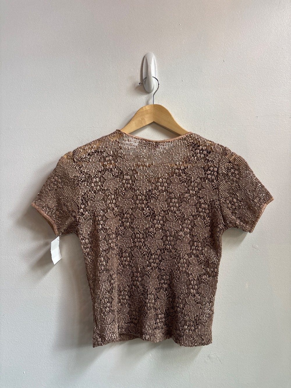 Would fit medium best. A rose gold top with a button front, short sleeves and sheer lace material