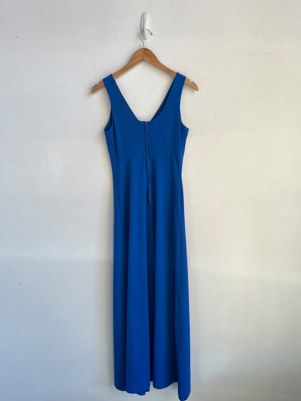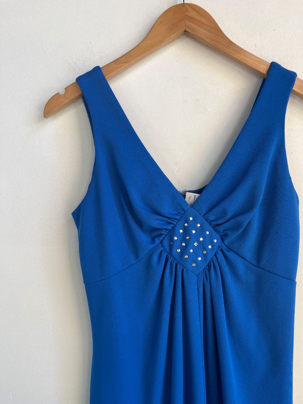 From the 70s, made in Montreal! A lovely V neck dress with a zip back, gathered bust with gems and tapered waist. Skirt is maxi lngth